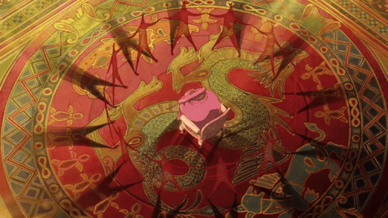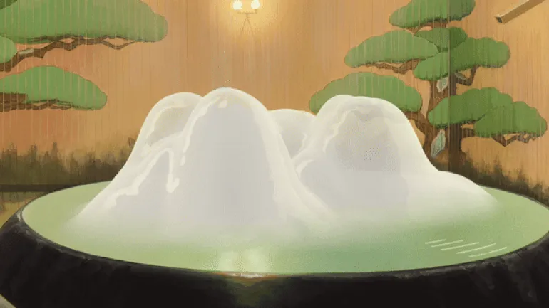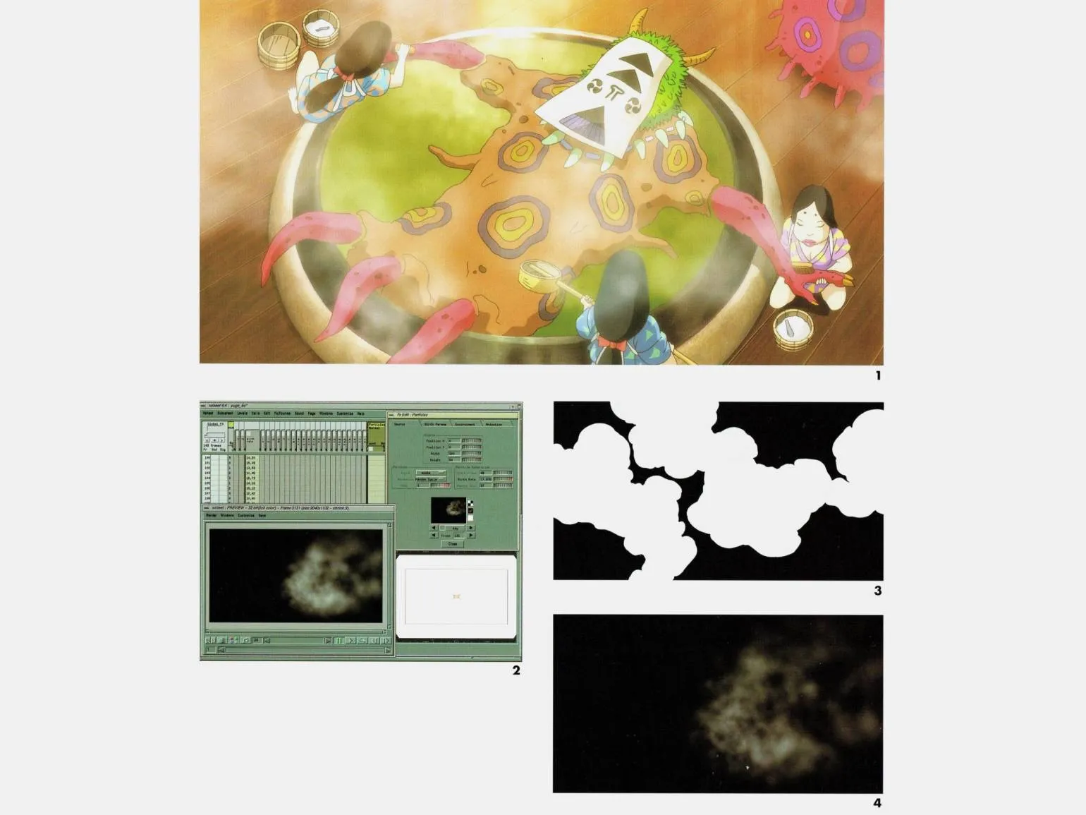 С цифровыми технологиями довольно легко создать реалистичный пар и дым, но студии не нужен был реализм. Поэтому для сцены с богом в ванной сначала художники нарисовали лайн для пара по правилам ручной анимации, так, чтобы он не перекрывал персонажей. Внутрь этого контура поместили дым, созданный с помощью системы частиц.