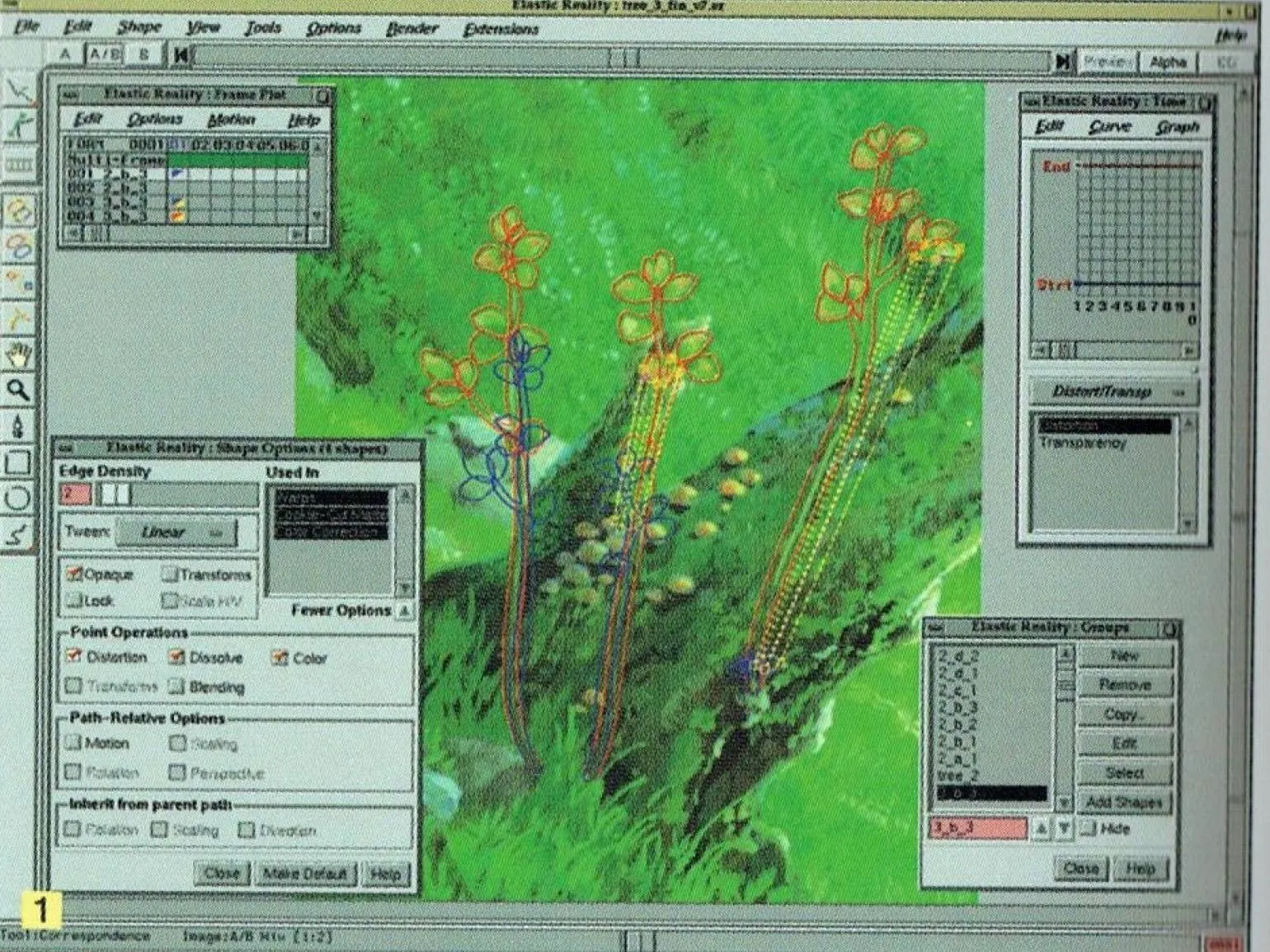 Скриншот программы, в которой делался морфинг. Растения вырастают согласно нарисованным цветным линиямИзображение: The Art of Princess Mononoke / Studio Ghibli, 2017
