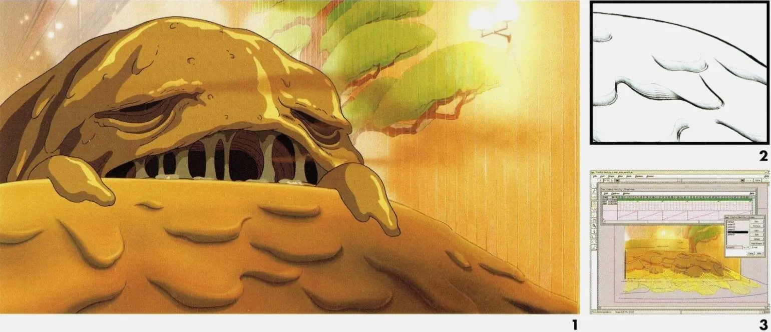 Вся сцена состояла примерно из 20 кадров, но через полгода работы ни один из них не был успешно завершён. Миядзаки, изначально сопротивлявшийся CG, начал терять терпение из-за медленной разработки и обратился к режиссёру компьютерной графики Ёсинори Сугано — посмотреть, сможет ли тот зарендерить монстра в 3D. Это было самым трудным испытанием в работе над CG, но оно убедило Миядзаки, что для 3D в творчестве студии есть место.