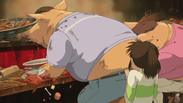 Когда Тихиро вместе с родителями попадает в волшебный мир, мама и папа девочки останавливаются поесть в пустом китайском ресторане, столы которого ломятся от вкусной еды. Позже Тихиро с ужасом обнаруживает, что её родители превратились в свиней, которые продолжают беспорядочно есть и сбивать посуду со столов.