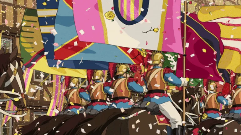 При помощи 3D создали и сцену в начале фильма с военным парадом. Все развевающиеся флаги сделаны в цифре: если одноцветную ткань ещё можно анимировать вручную, то рисовать покадрово множество флагов с разными узорами будет слишком сложно.