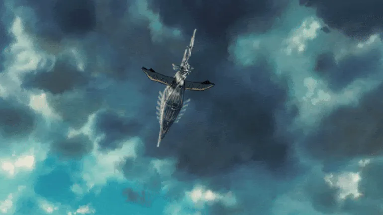 Её традиционно применяли для некоторых сцен с дымом и паром, а ещё — для создания конфетти на параде и падающих листовок. Делали их в программе Particle. На заднем плане поместили не проработанную CG-анимацию, а на переднем — нарисованные вручную ключевые кадры.