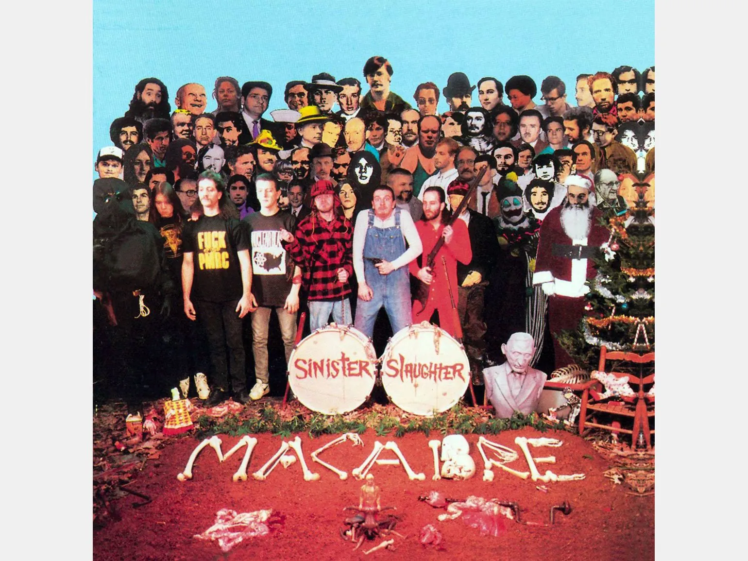 На иллюстрации для лицевой стороны обложки собран коллаж из множества известных людей, фигуры которых были изготовлены в натуральную величину. Среди них можно заметить Боба Дилана, Зигмунда Фрейда, Оскара Уайльда, Мэрилин Монро. Все персонажи сделаны из картона, кроме участников квартета — на фотографии стоят их восковые фигуры из музея мадам Тюссо. Перед барабаном с надписью «Оркестр клуба одиноких сердец сержанта Пеппера» находится могильная клумба с выложенной из цветов надписью «Beatles». На неё смотрят картонные фигуры молодых «битлов», будто бы намекая этим взглядом, что музыка группы уже не будет прежней.