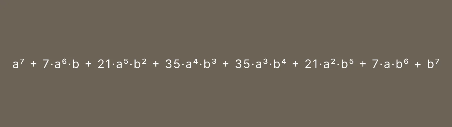 Выглядит вроде бы просто. Но представьте, сколько нужно совершить операций умножения, чтобы возвести эту же сумму, например, в седьмую степень. В конечной формуле будет аж восемь слагаемых: