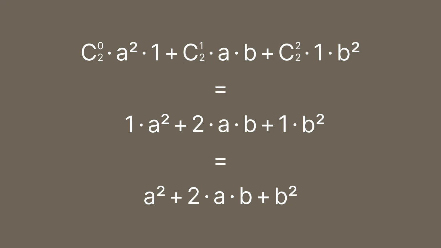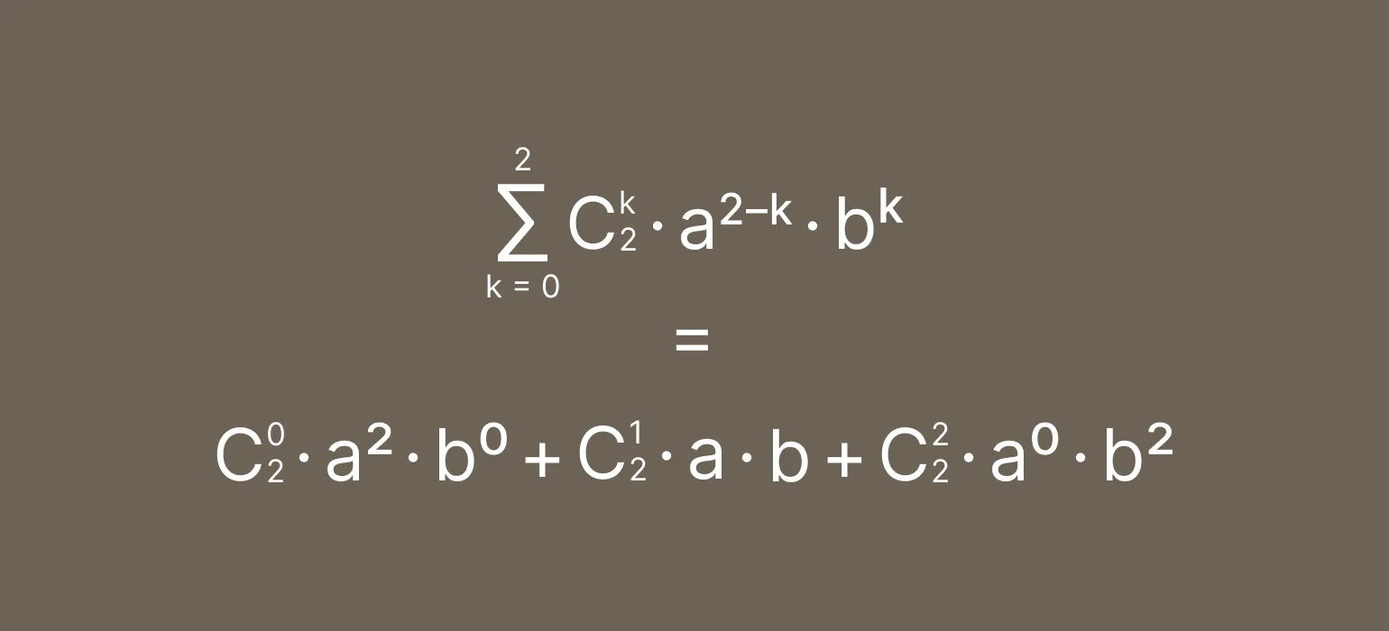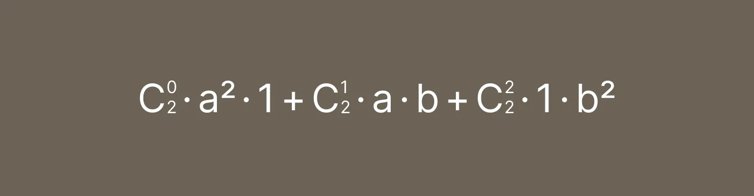 Теперь переходим к более сложным вещам — биномиальным коэффициентам, которые обозначаются буквой C. Они показывают, на какие числа нужно умножить каждое слагаемое в многочлене. Например, в выражении a2 + 2ab + b2 слагаемыми будут a2, ab и b2, а их коэффициентами: 1, 2 и 1.