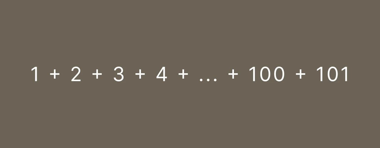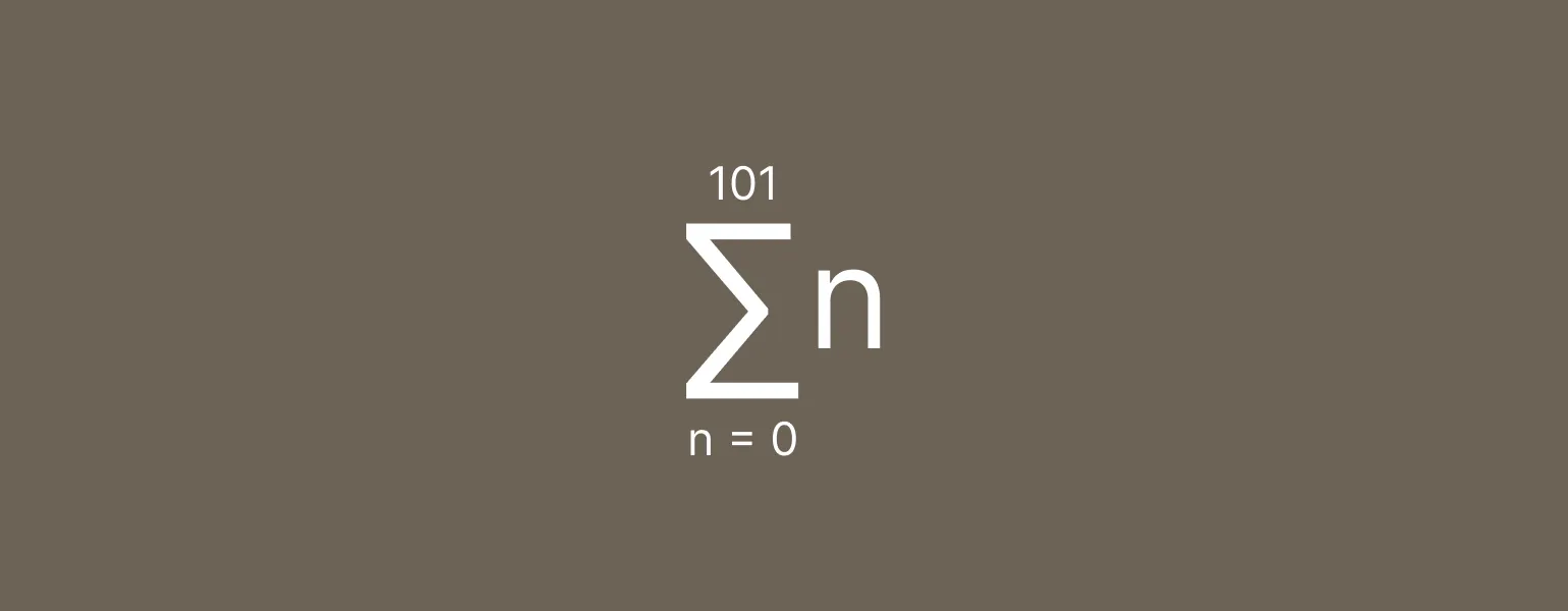 Здесь мы добавляем букву n, которая представляет собой все числа от 1 до 101 по порядку. Под знаком суммы мы указываем, с какого числа начинаем считать, а сверху — на каком заканчиваем. Получается, это выражение просуммирует все числа от 1 до 101 (ответ: 5151).