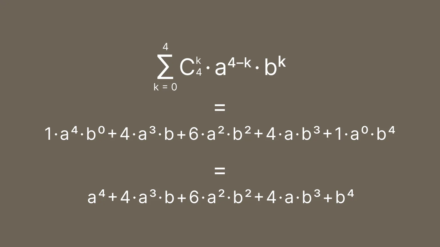 Таким же способом можно находить слагаемые для степеней и побольше. Давайте для примера посчитаем по формуле бинома Ньютона сумму двух чисел, возведённую в четвёртую степень: