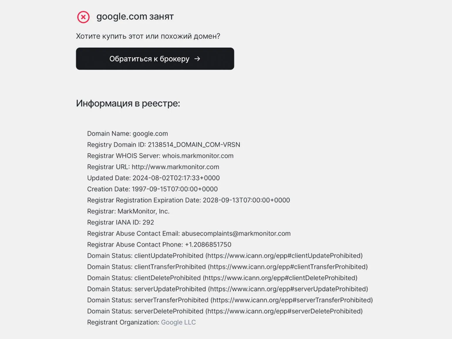 Например, если проверить в одном из сервисов сайт google.com, то можно узнать, что домен зарегистрировали в 1997 году, регистратором выступает компания MarkMonitor, а срок регистрации закончится в 2028 году. Да, можно даже не пытаться «угнать» домен у большой компании. MarkMonitor — посредник Google в вопросах регистрации — заранее продлит право на владение, поэтому не выйдет быстро переоформить google.com на себя 🙂