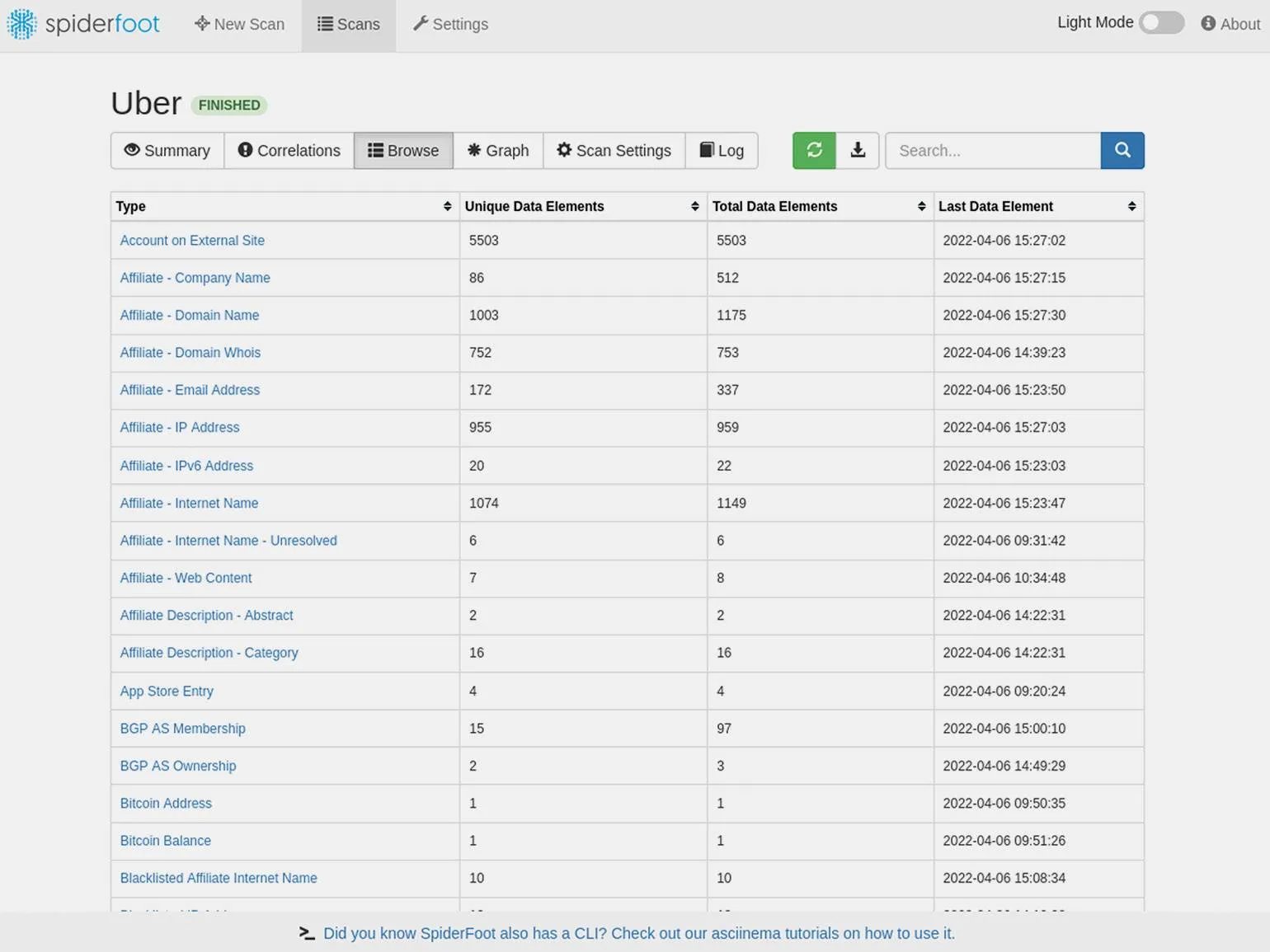 SpiderFoot — инструмент для автоматизации OSINT. Утилита собирает IP-адреса, домены, адреса электронной почты, имена пользователей и ищет полезные данные в известных утечках. С помощью SpiderFoot можно выявлять уязвимости, анализировать цифровой след пользователей и расследовать инциденты в сфере информационной безопасности. В конце исследования SpiderFoot генерирует отчёт, показывая, какие полезные данные получилось найти в открытом доступе.