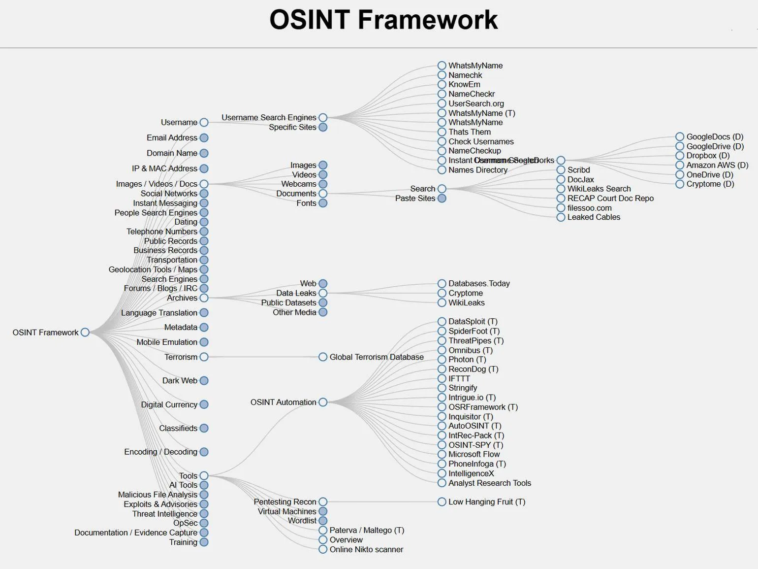 OSINT Framework — коллекция ссылок на полезные инструменты и сервисы для разведки по открытым источникам. На сайте можно найти как платные, так и бесплатные ресурсы.