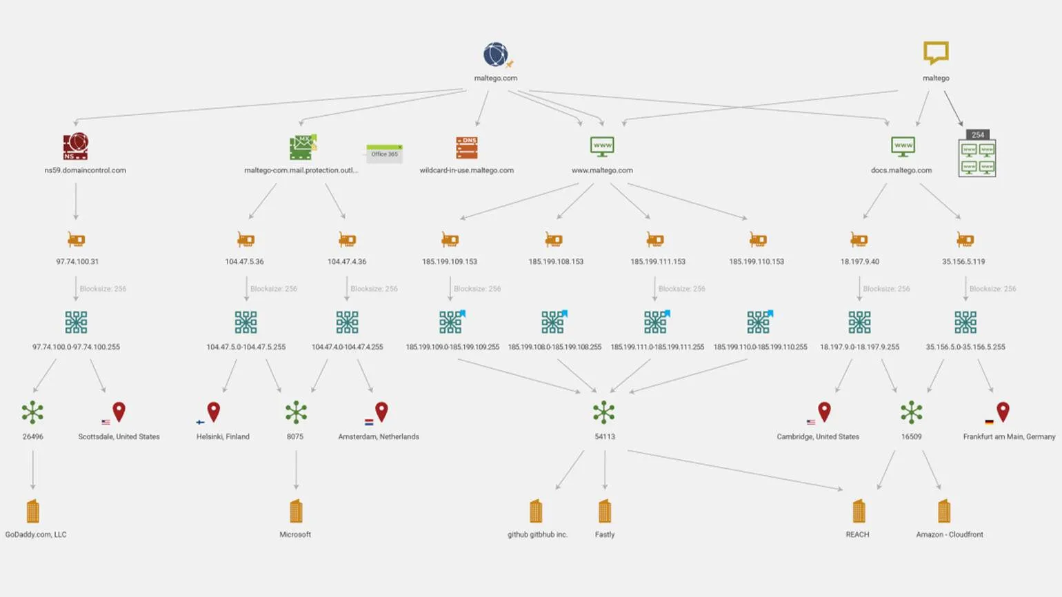 Maltego — инструмент для визуализации данных из открытых источников. С его помощью можно обработать найденную информацию и построить графы связей. Например, с помощью графа можно понять, с какими доменами связан адрес электронной почты пользователя.