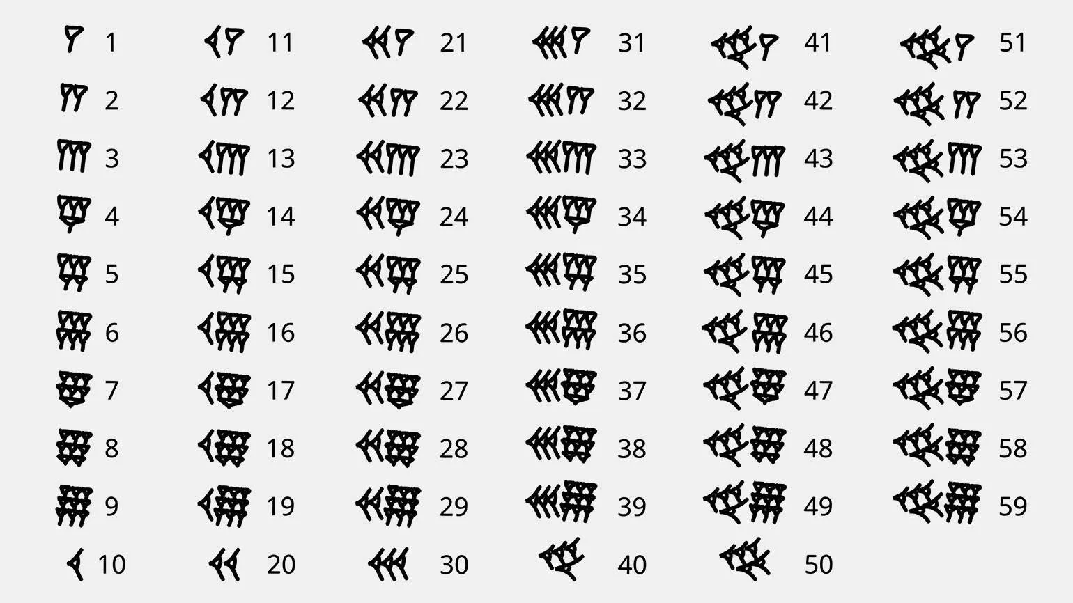 Вавилонская система использовала два основных символа: вертикальный клин для обозначения единиц и горизонтальный клин для десятков. Числа записывались справа налево, а новый разряд начинался после определённой комбинации этих символов. Вертикальный клин имел двойное значение — обозначал как единицу, так и число 60 с его степенями, откуда и пошло название «шестидесятеричная система». Позиционный характер системы проявлялся в том, что при записи чисел больше 60 значение символа (1 или 60) определялось его положением в числе.