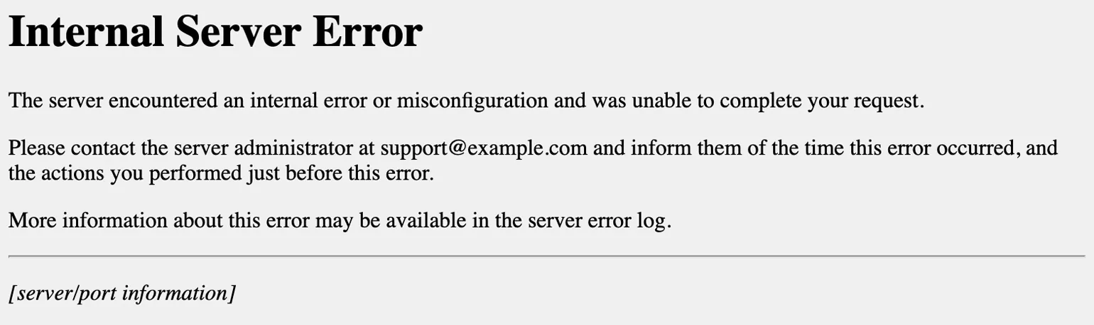 Само сообщение содержит информацию о том, что сайт не работает из-за внутренней ошибки на сервере. То есть проблема не в браузере, не на стороне пользователя, а именно на сервере: «The server encountered an internal error or misconfiguration and was unable to complete your request».