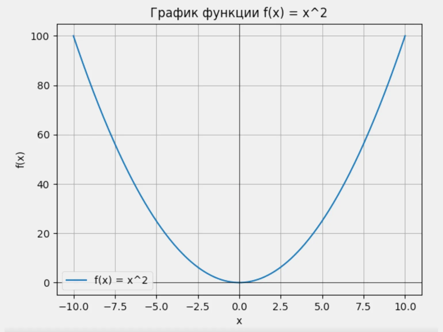График f(x) = x² — это симметричная кривая (парабола) с вершиной в начале координат. Она показывает переход от убывания к возрастанию Изображение: Google Colab / Skillbox Media