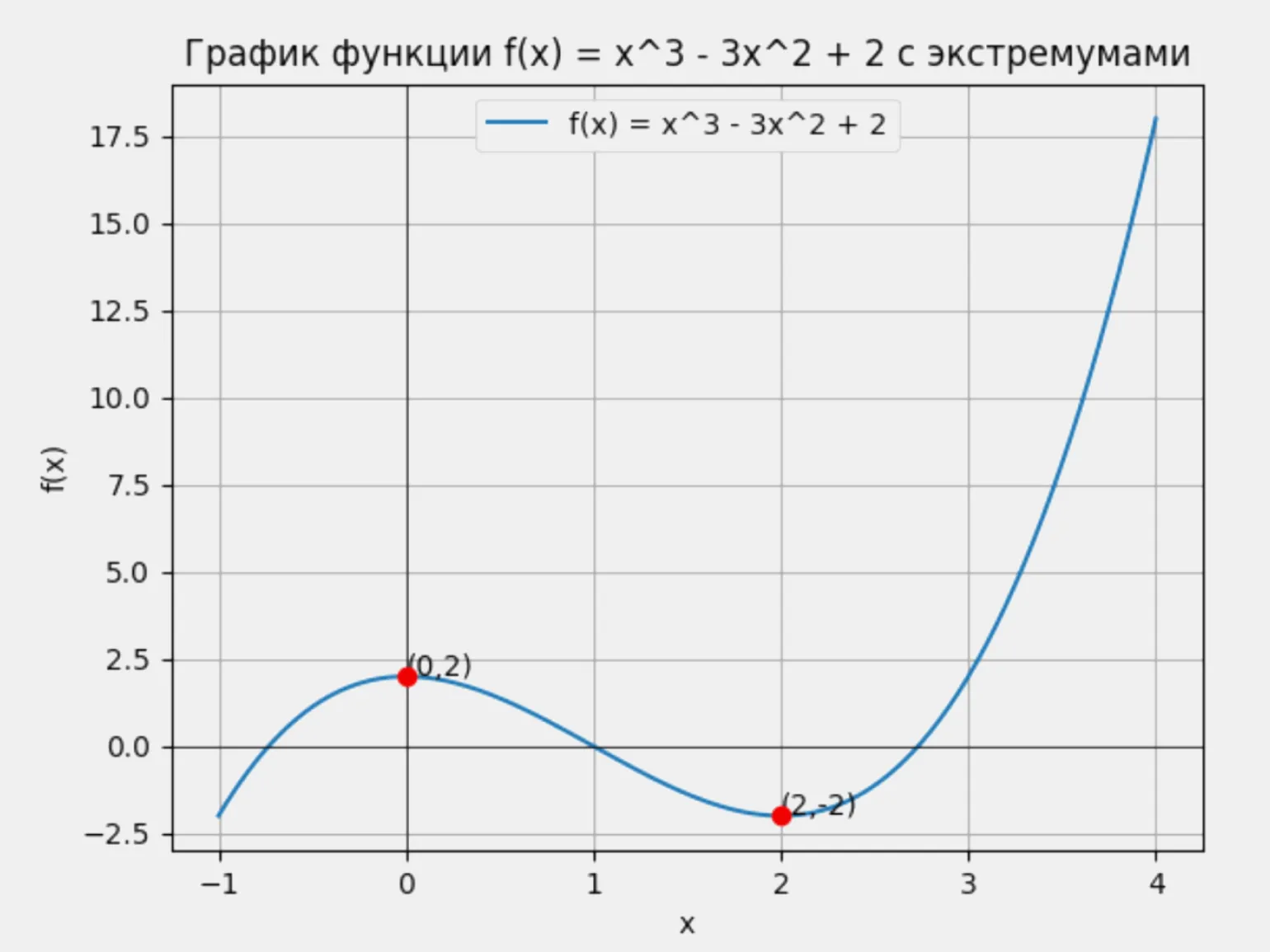 График функции f(x) = x³ − 3x² + 2. В точке x = 0 функция достигает максимума, равного f(0) = 2, а в точке x = 2 — минимума, f(2) = −2. На графике эти точки отмечены координатами (0, 2) и (2, −2)Изображение: Google Colab / Skillbox Media