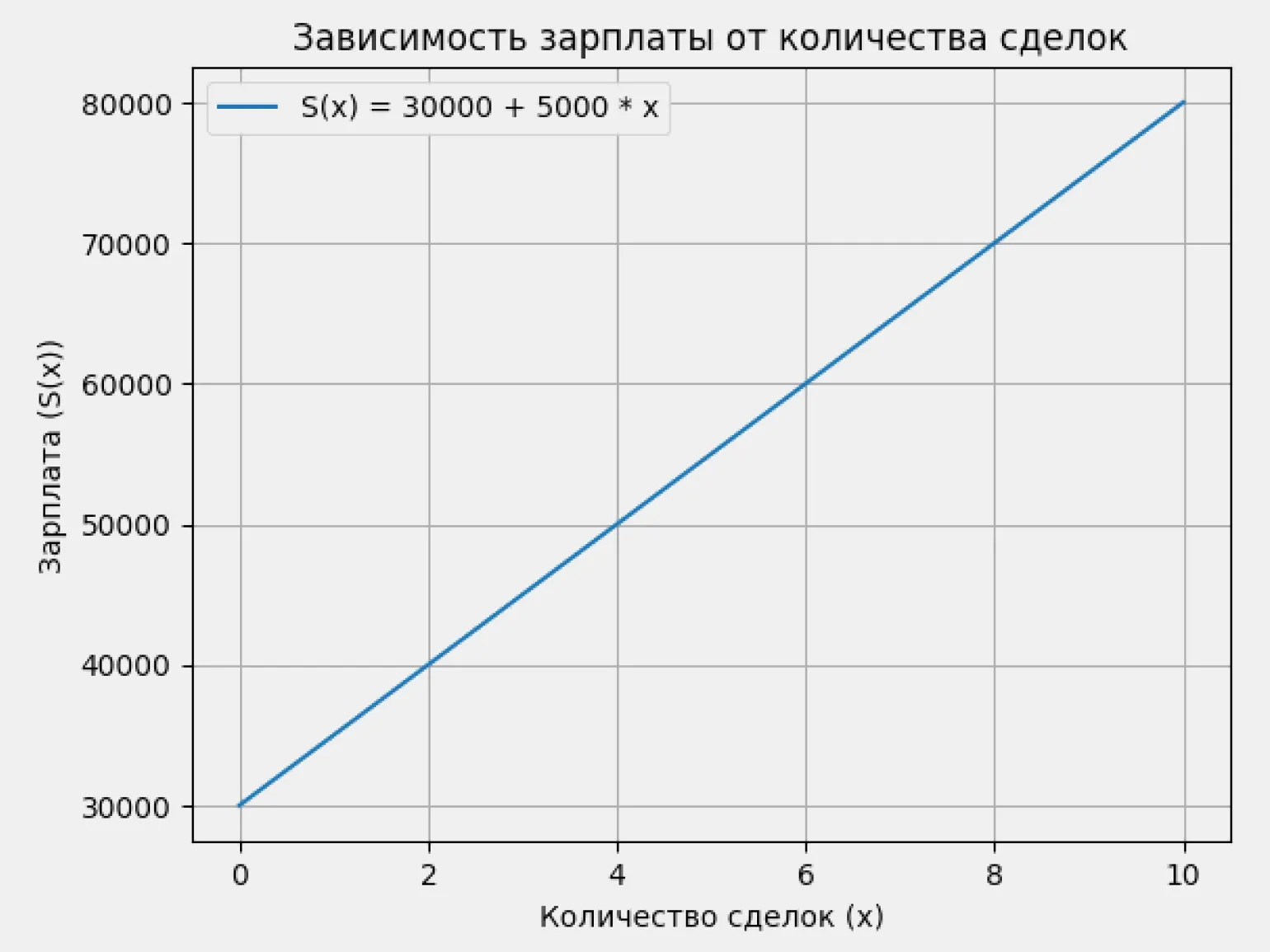 Ниже представлен график этой же функции. На нём мы можем наглядно увидеть зависимость зарплаты от количества сделок: по горизонтальной оси x отмечено количество сделок (независимая переменная), а по вертикальной оси y — размер зарплаты в рублях (зависимая переменная).