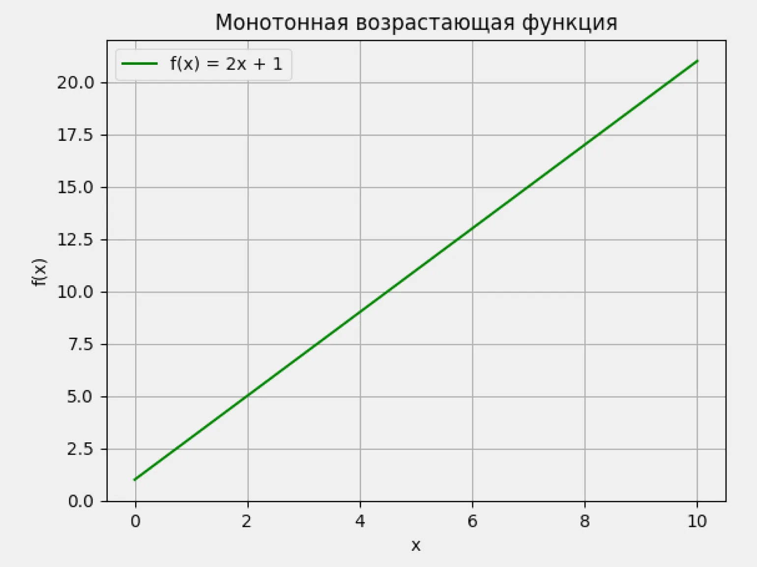 Производная положительна: f'(x) > 0. В этом случае функция строго возрастает на всём промежутке — каждое следующее значение больше предыдущего. Возьмём, например, линейную функцию f(x) = 2x + 1. Её производная равна f'(x) = 2, то есть функция растёт с постоянной скоростью. Поэтому она возрастает при любых значениях x: