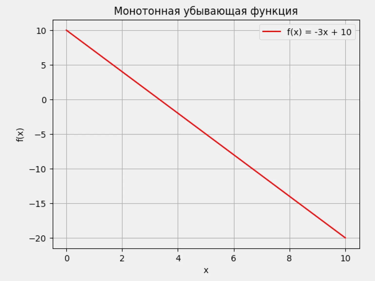 Производная отрицательна: f'(x) < 0. Когда производная меньше нуля, функция убывает — то есть её значения последовательно уменьшаются. Например, возьмём функцию f(x) = −3x + 10. Её производная f'(x) = −3 остаётся отрицательной при любом x: