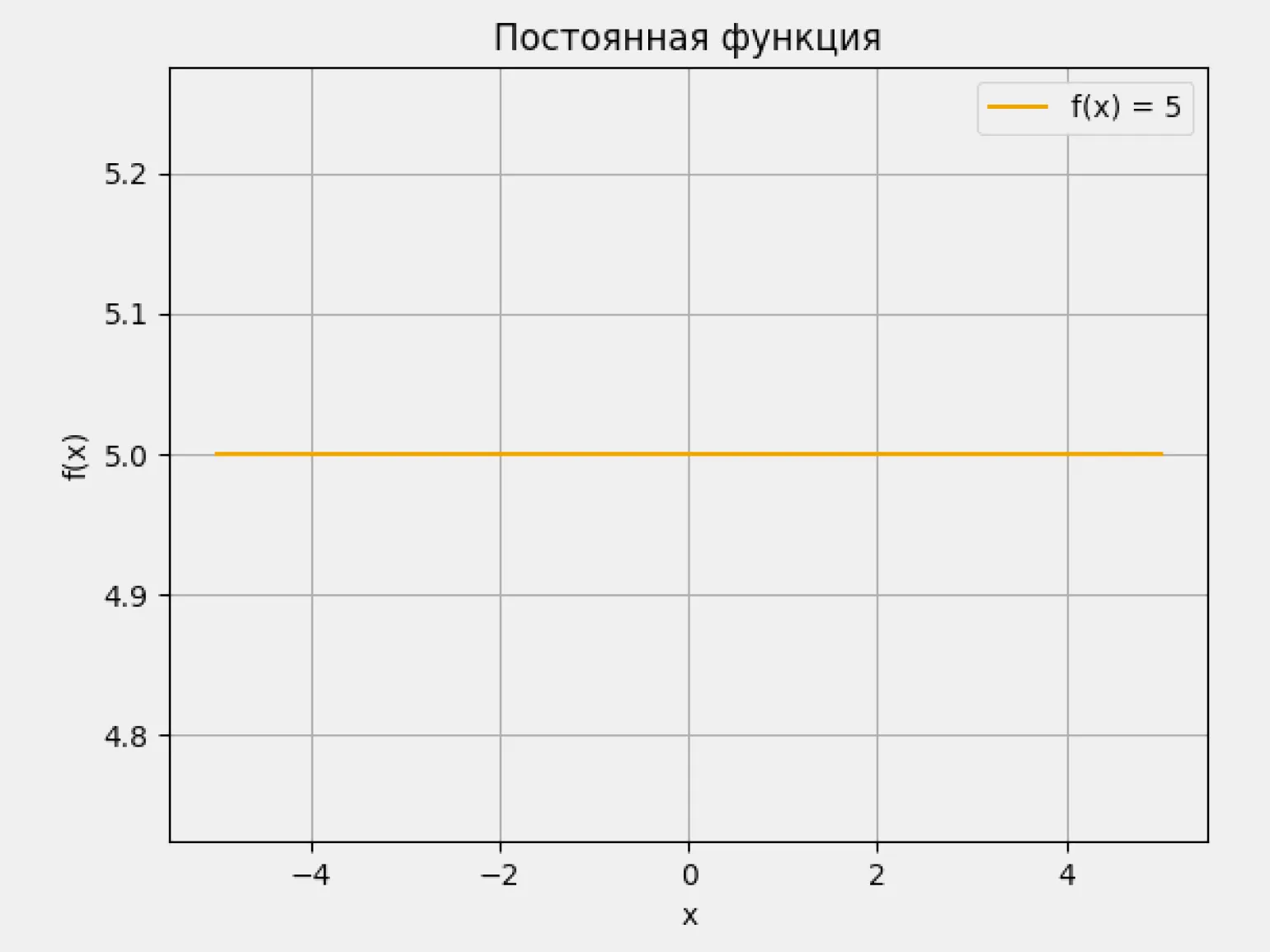 Производная равна нулю: f'(x) = 0. Если производная равна нулю на всём промежутке, функция остаётся постоянной и не меняет значения. Это хорошо видно на функции f(x) = 5. Её производная f'(x) = 0 при любом x, поэтому график выглядит как горизонтальная прямая:
