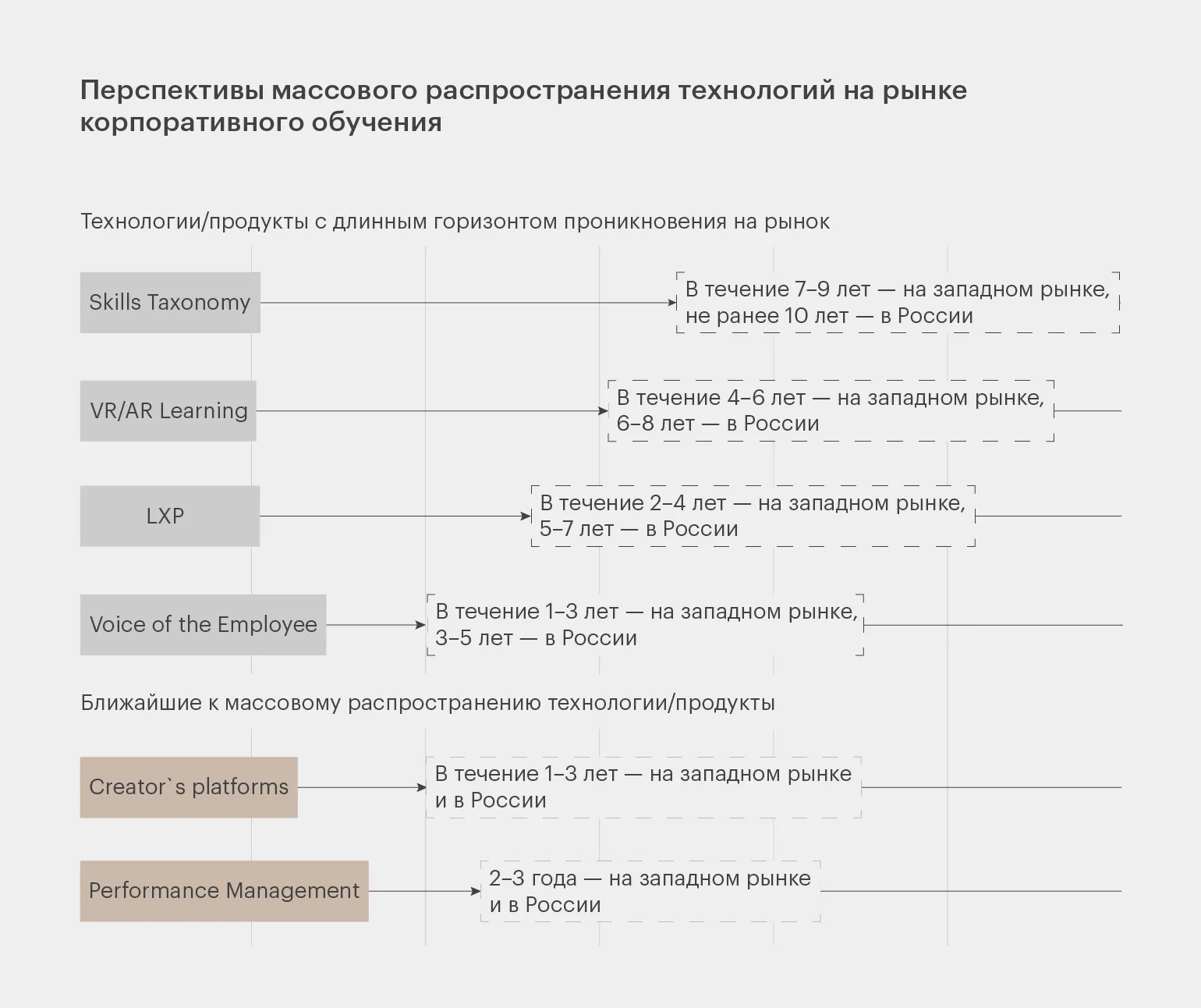 Когда ожидать массового продукта. Поскольку у корпоративных университетов есть запрос на такой продукт, в течение двух-четырёх лет он, скорее всего, появится. В России — в течение пяти-семи лет.