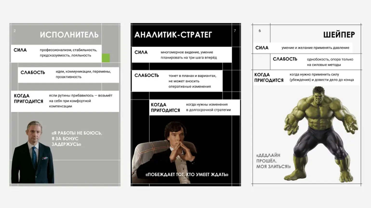 Другой пример приводит Юлия Максина: в обучении для директоров компании «М.Видео — Эльдорадо» роли в команде по Белбину обыграли с помощью популярных персонажей комиксов на карточках — и так ненавязчиво помогли систематизировать новые знания.
