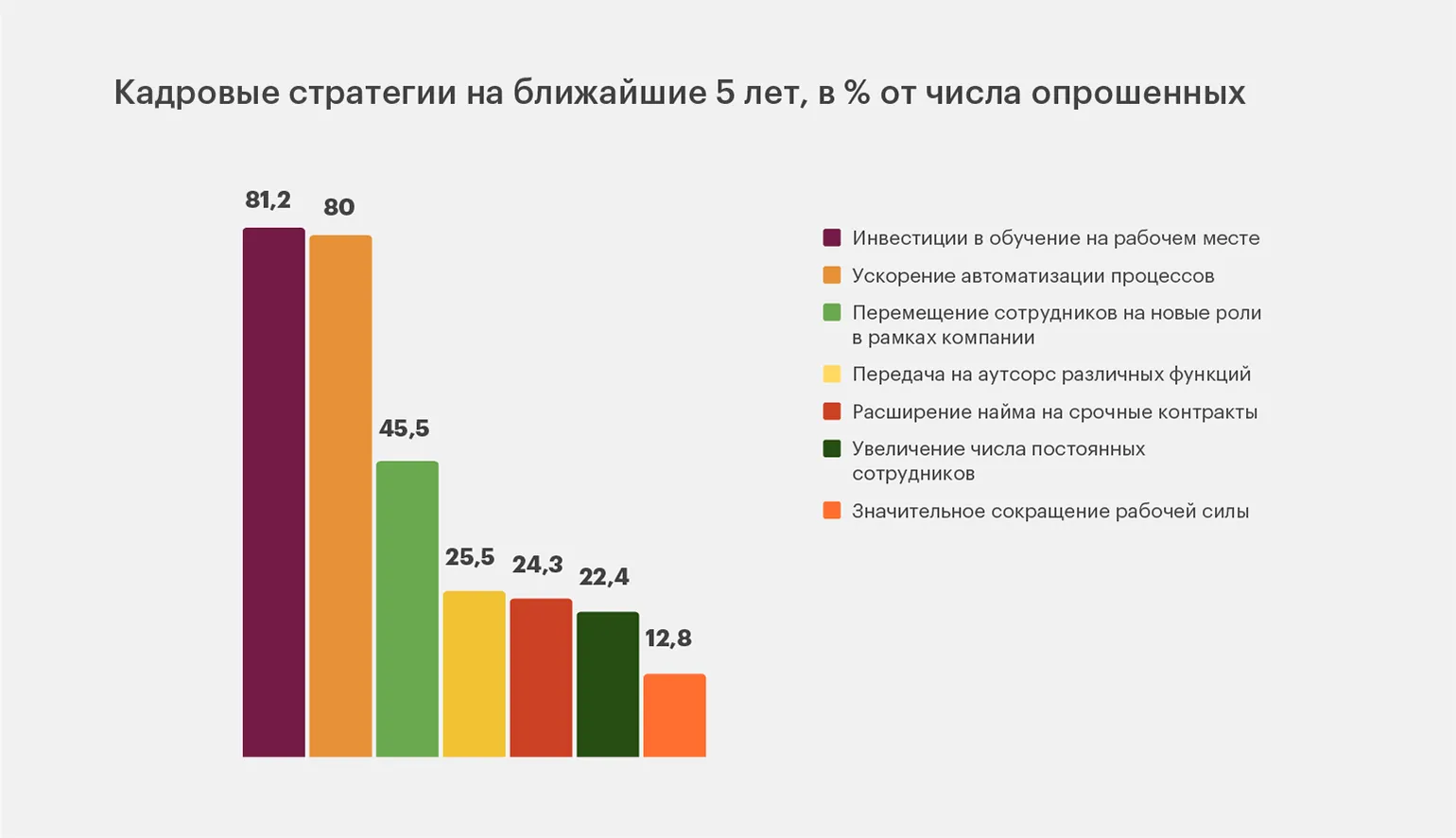 Поэтому ключевыми стратегиями в управлении персоналом в ближайшие пять лет более чем для 80% опрошенных будут инвестиции в переобучение на рабочем месте и автоматизация процессов. А ещё 45,5% назвали перемещение сотрудников с угасающих позиций на новые.