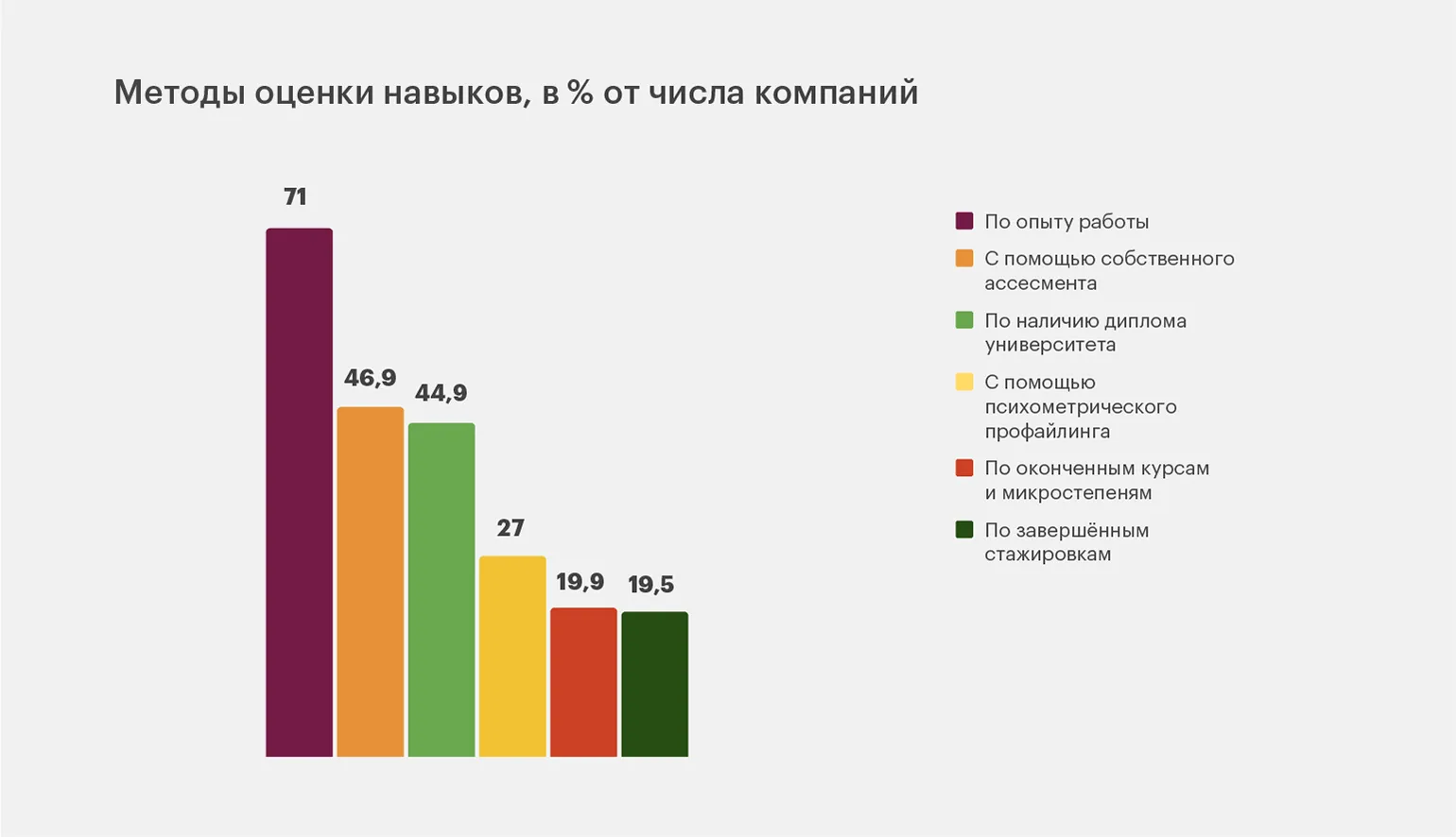 А вот насколько кандидаты на вакансию владеют теми или иными навыками, работодатели оценивают чаще всего по формальным признакам. Более 71% опрошенных отметили, что при приёме на работу чаще всего смотрят на опыт кандидата, а почти 45% — на то, есть ли у него университетский диплом.