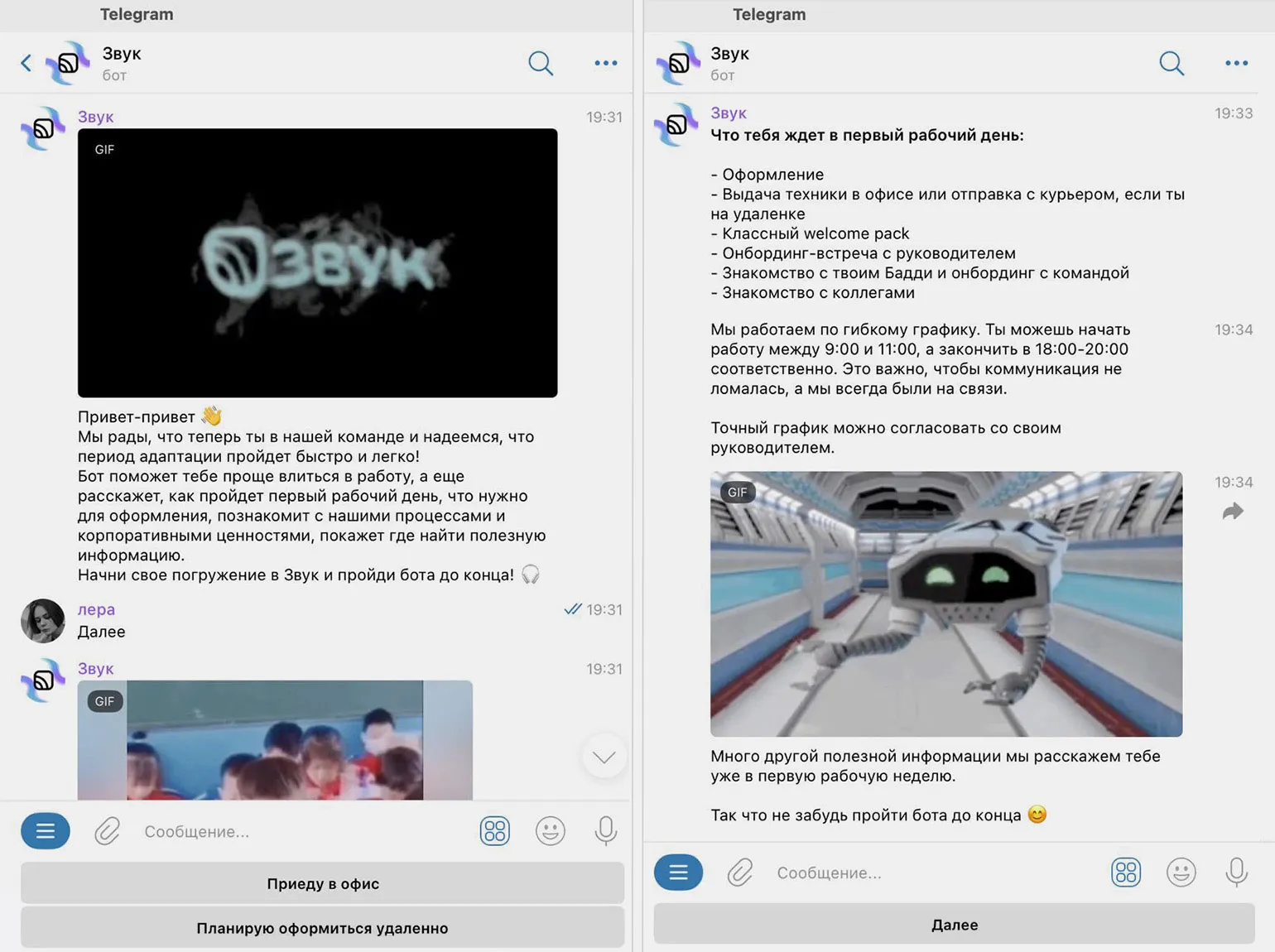 Мы тоже сделали отдельный чат-бот для адаптации новеньких. Точно в нужный срок он информирует о правилах посещения офиса, отправляет список документов для оформления на работу, просит поделиться интересными фактами о себе (для публикации в еженедельном корпоративном дайджесте), предлагает послушать музыкальный плейлист для сотрудников «Звука». Также чат-бот проводит регулярные опросы, рассказывает про бадди-программу и напоминает о регулярных встречах с наставником.