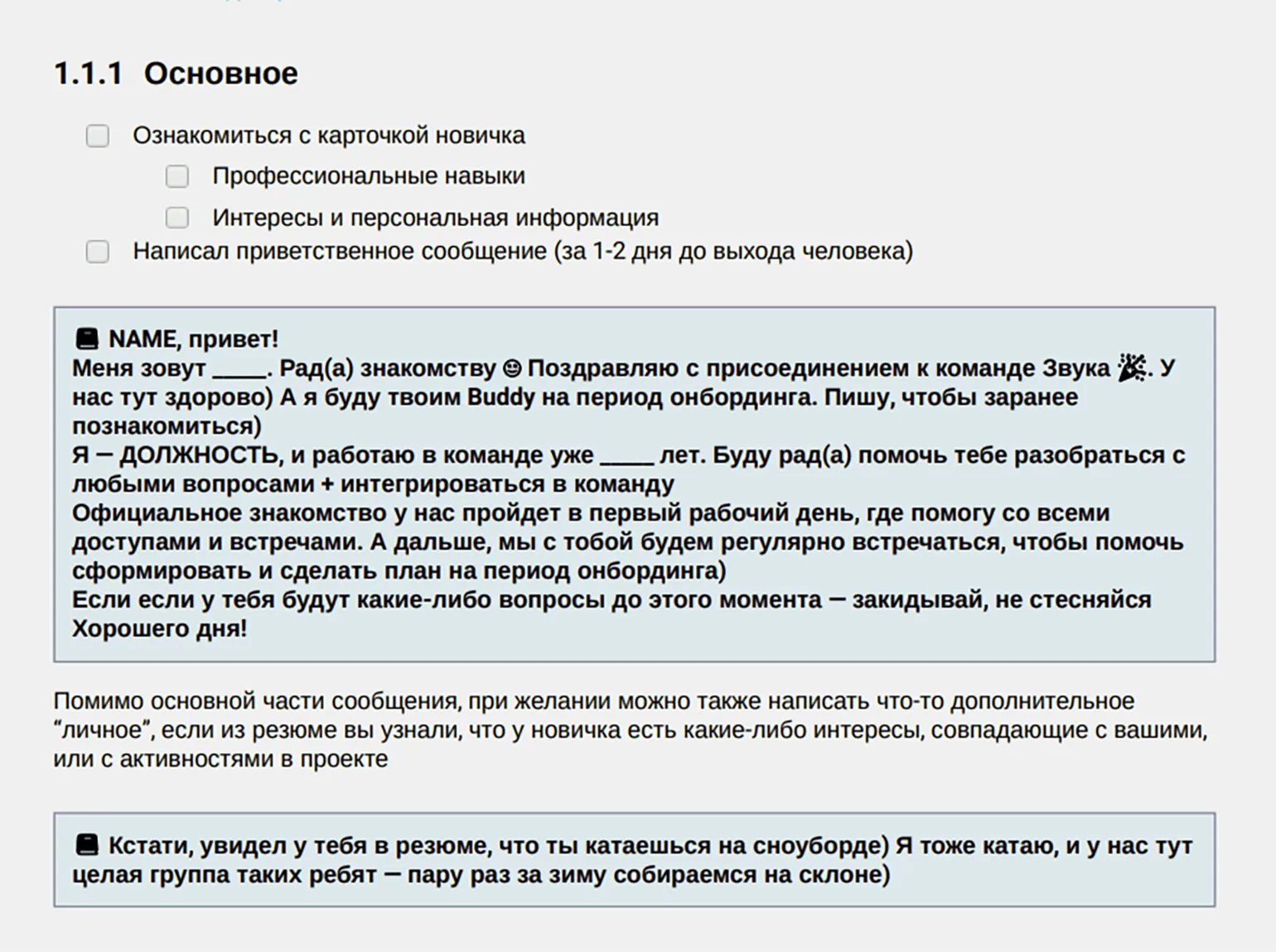 Системность также должна быть в материалах для бадди и новичков. Мы сделали методичку и чек-листы, в которых пошагово расписано, что каждый из них должен делать и в какой день.