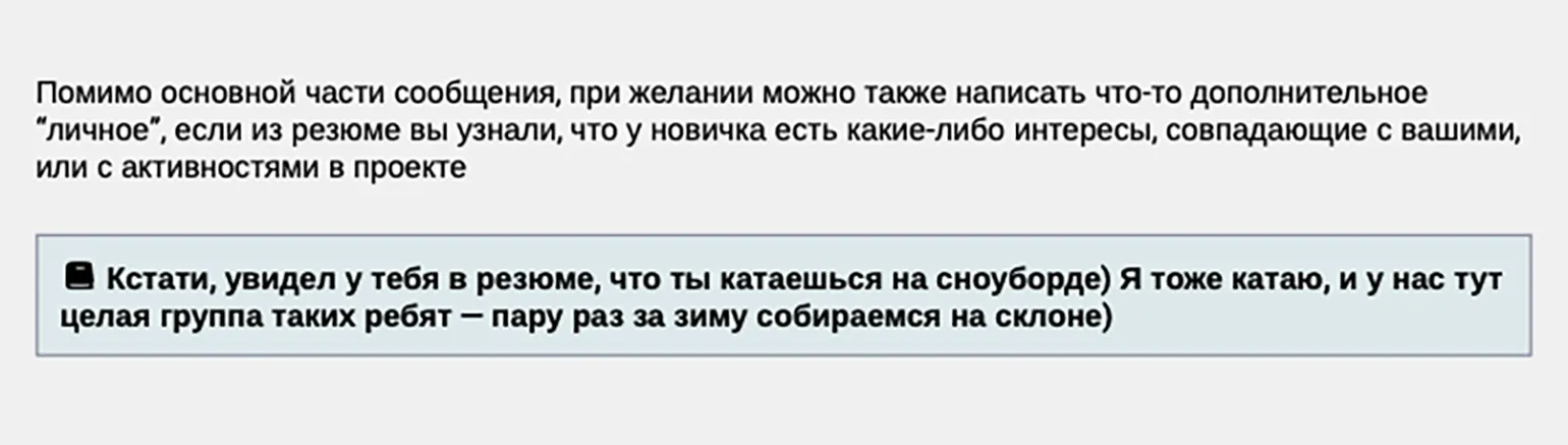 Проще всего объединять людей через общее хобби. В «Звуке» каждый сотрудник в первый рабочий день пишет на своей странице в Jira про себя и свои увлечения. Предположим, «Люблю читать Есенина и кататься на санках». Мы советуем бадди учитывать эту информацию, находить точки соприкосновения и обсуждать с подопечным: