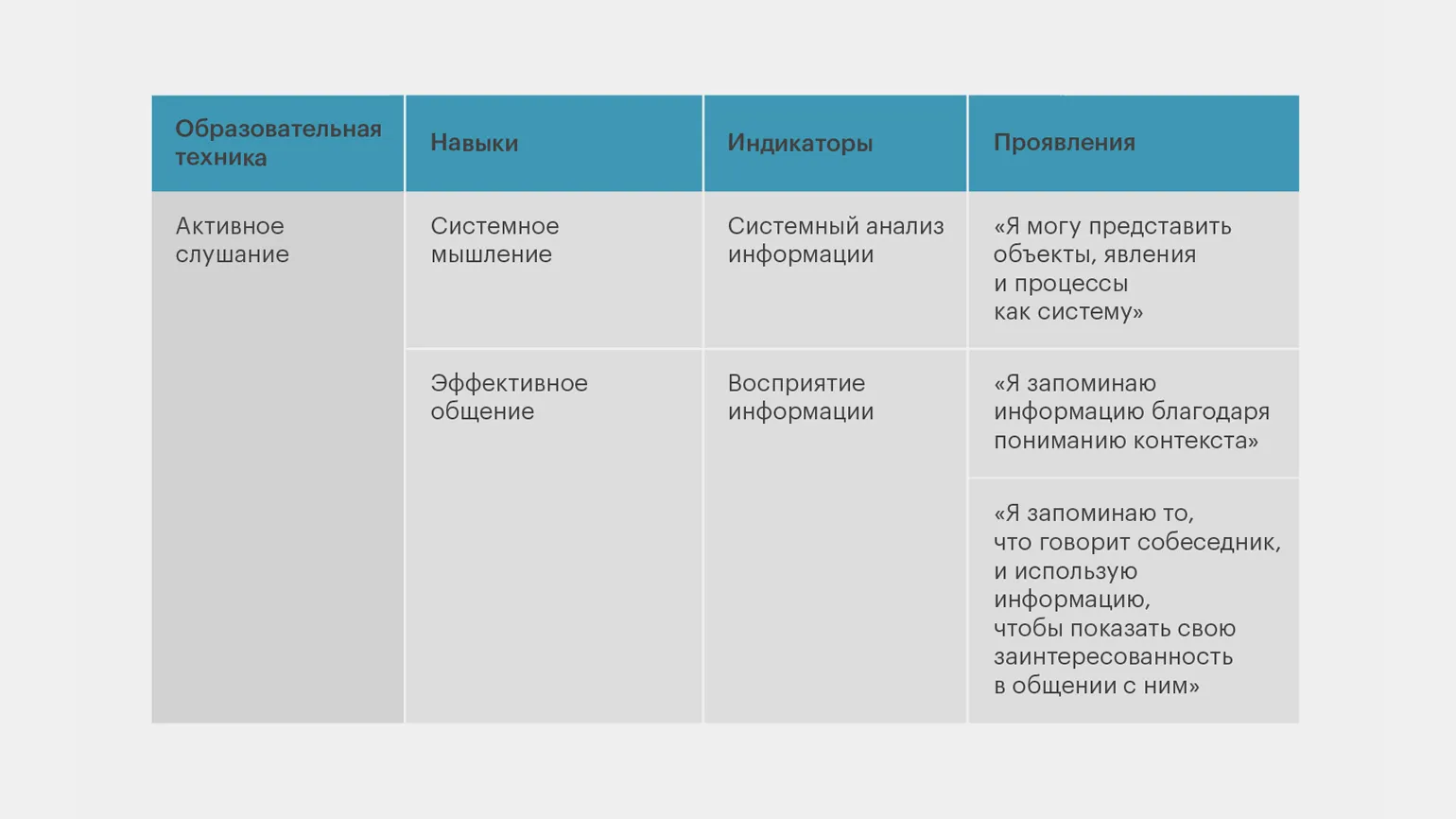 Также в разработанной матрице компетенций должны быть образовательные техники — совокупности методов и приёмов, направленные на тренировку тех или иных проявлений навыка. Например, активное слушание, контекстное или ассоциативное запоминание.