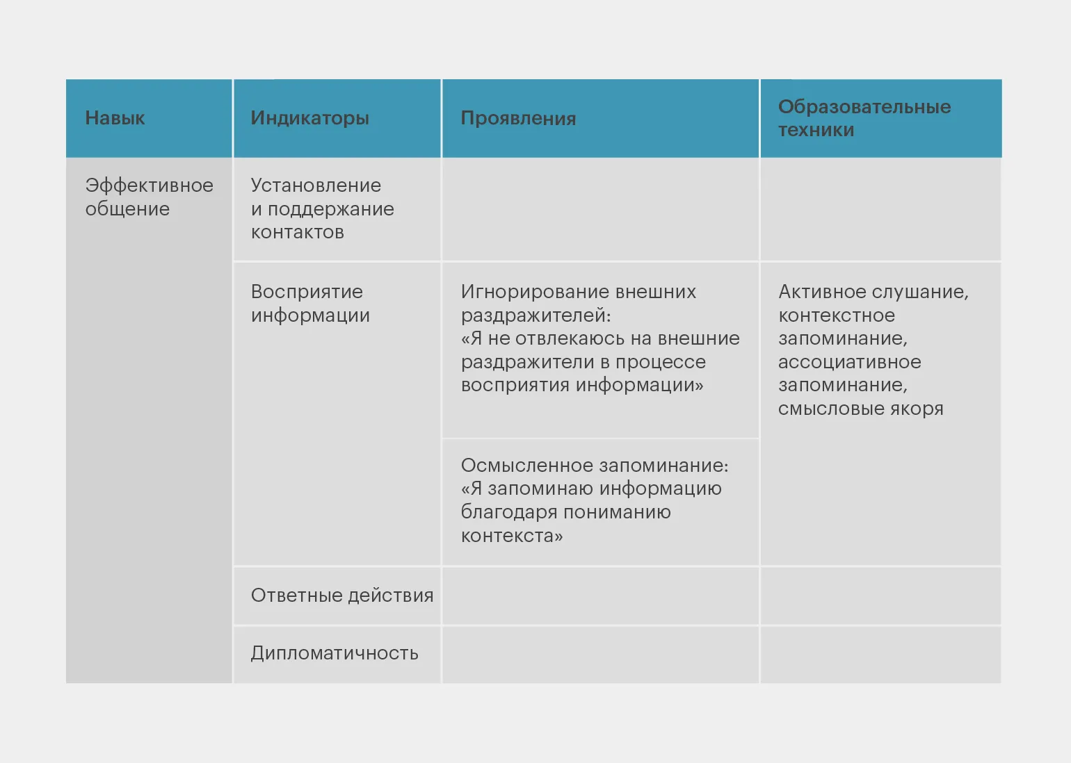 Например, навык эффективного общения можно разделить на такие индикаторы: установление и поддержание контактов, восприятие информации, ответные действия, дипломатичность. В свою очередь, каждый индикатор раскладывается на конкретные проявления в мыслительной или практической деятельности, которые можно наблюдать и измерять. Так, индикатор «восприятие информации» может состоять из проявлений «Я не отвлекаюсь на внешние раздражители» и «Я запоминаю информацию благодаря пониманию контекста».
