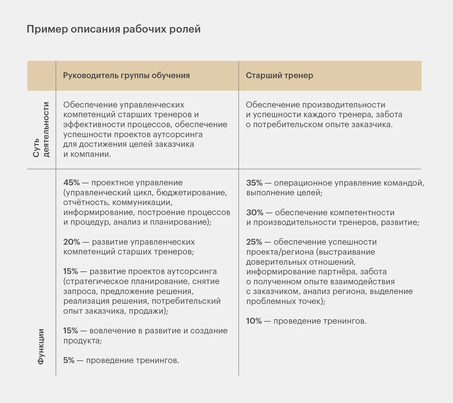 Один из ключевых элементов стандартизации деятельности — хорошие должностные инструкции. Часто должностная инструкция — большой документ, описанный юридическим языком, из которого сотруднику непонятно, чем конкретно он должен заниматься. На самом деле в должностной инструкции должны быть прописаны конкретные ключевые функции, не больше семи, и процент времени, который на каждую из этих функций уходит, а в идеале и ключевые показатели эффективности этой роли. Если у вас есть такой документ для должностной роли, человеку понятно, что он должен знать и уметь и сколько времени на это тратить.