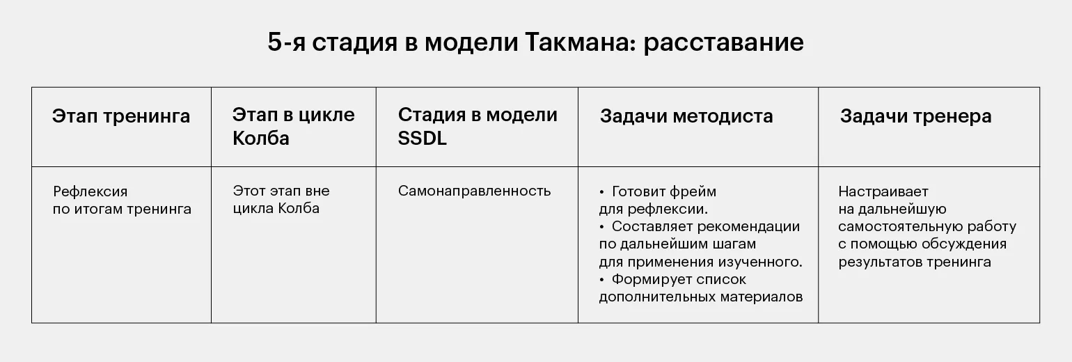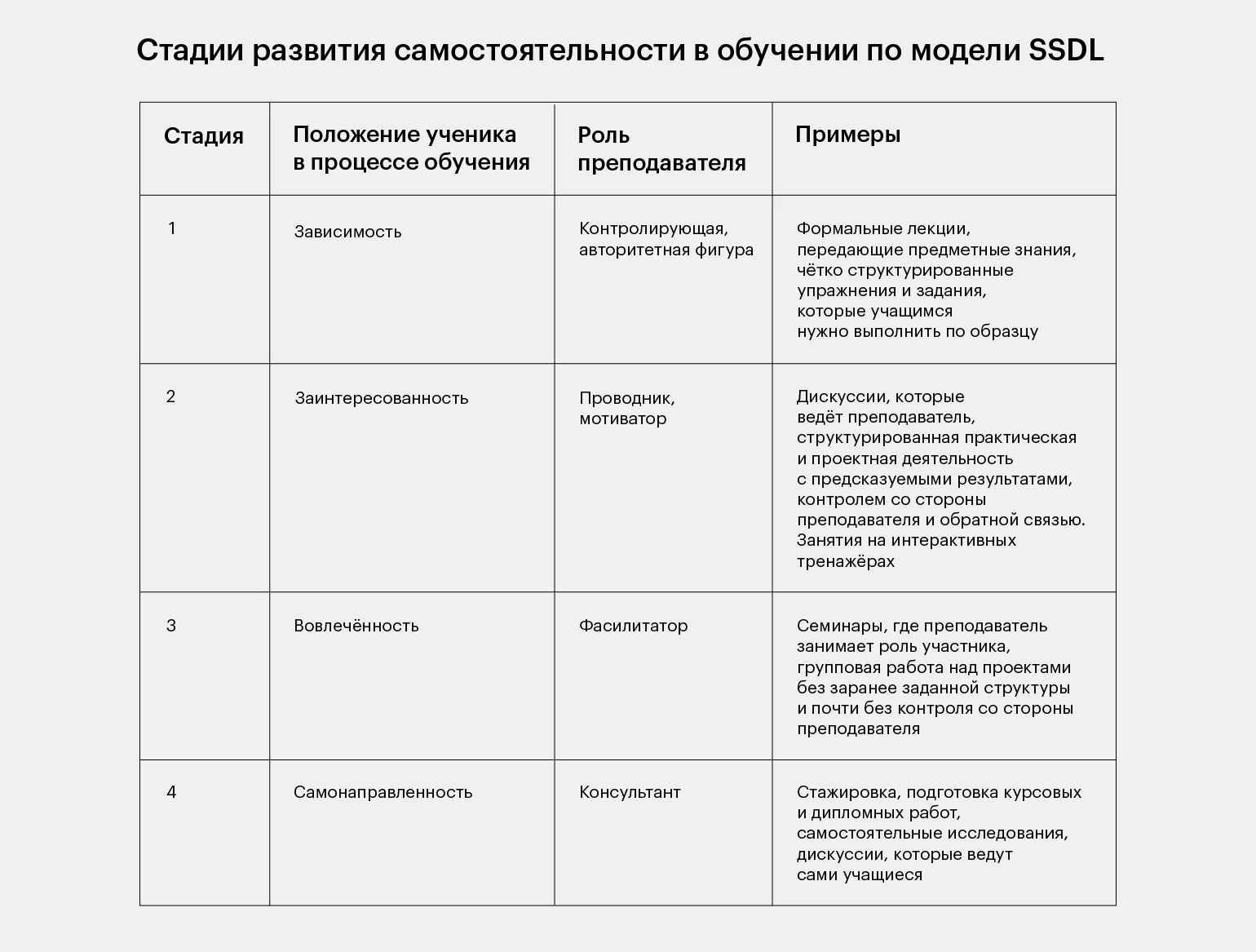 Заметим, что уровень самонаправленности по модели SSDL включает в себя и четвёртую, и пятую стадии по модели Такмана. Самонаправленный учащийся не только сам ставит цели и идёт к их достижению, но также оценивает результат, подводит итоги, — как и команда на стадии расставания.