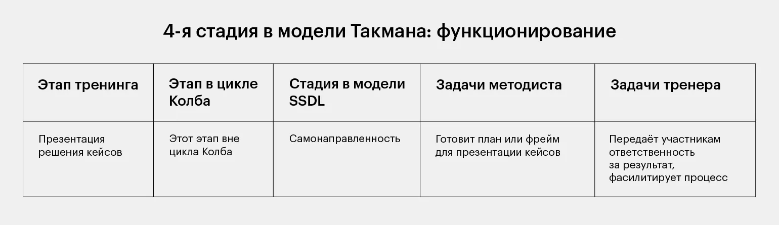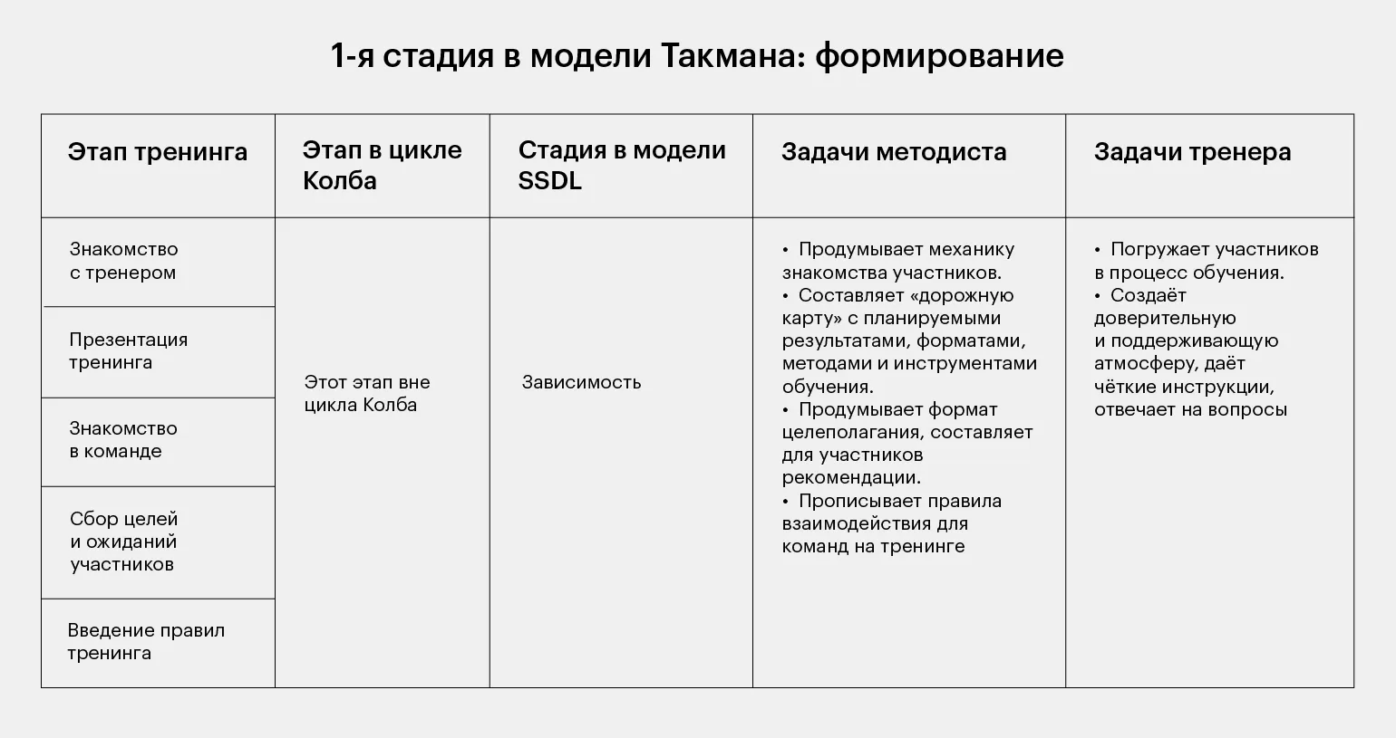 Эта модель описывает этапы развития команды, которые важно учитывать как методисту, так и преподавателю или бизнес-тренеру.