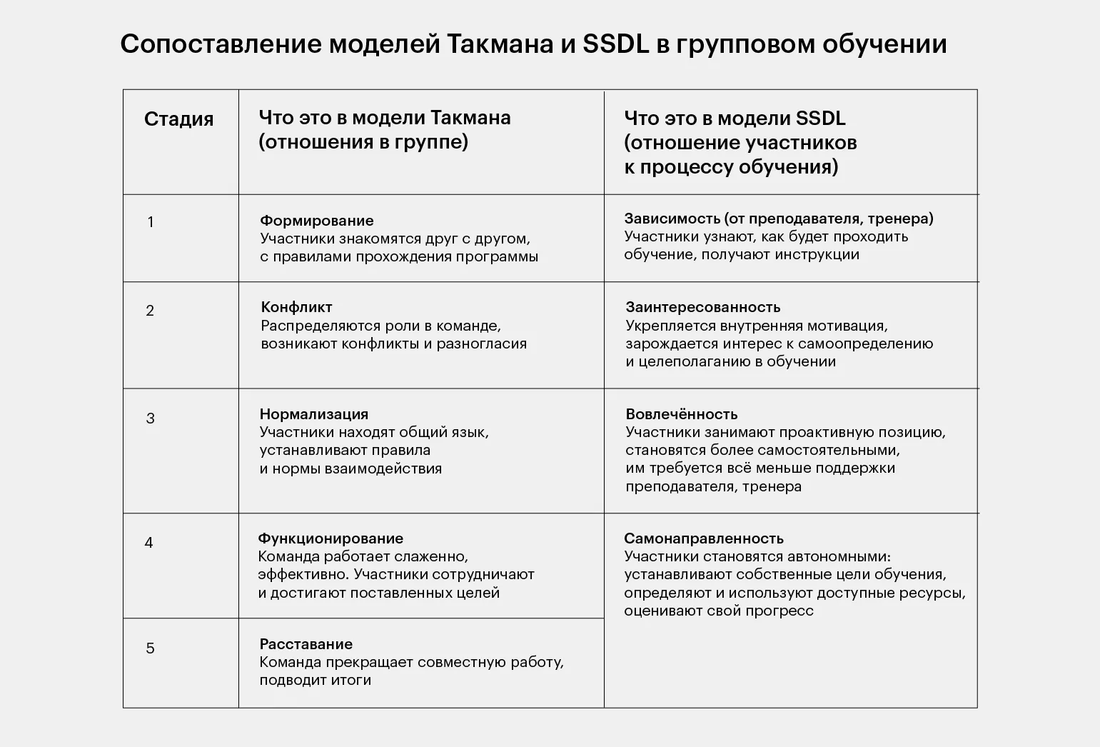 Итак, модель Такмана описывает групповую динамику, а модель SSDL — динамику развития самостоятельности в обучении. При этом, если сопоставить две модели, мы увидим, что они обе описывают движение от зависимой позиции участников к автономности, только в одном случае на уровне команд, а в другом — на уровне индивида.