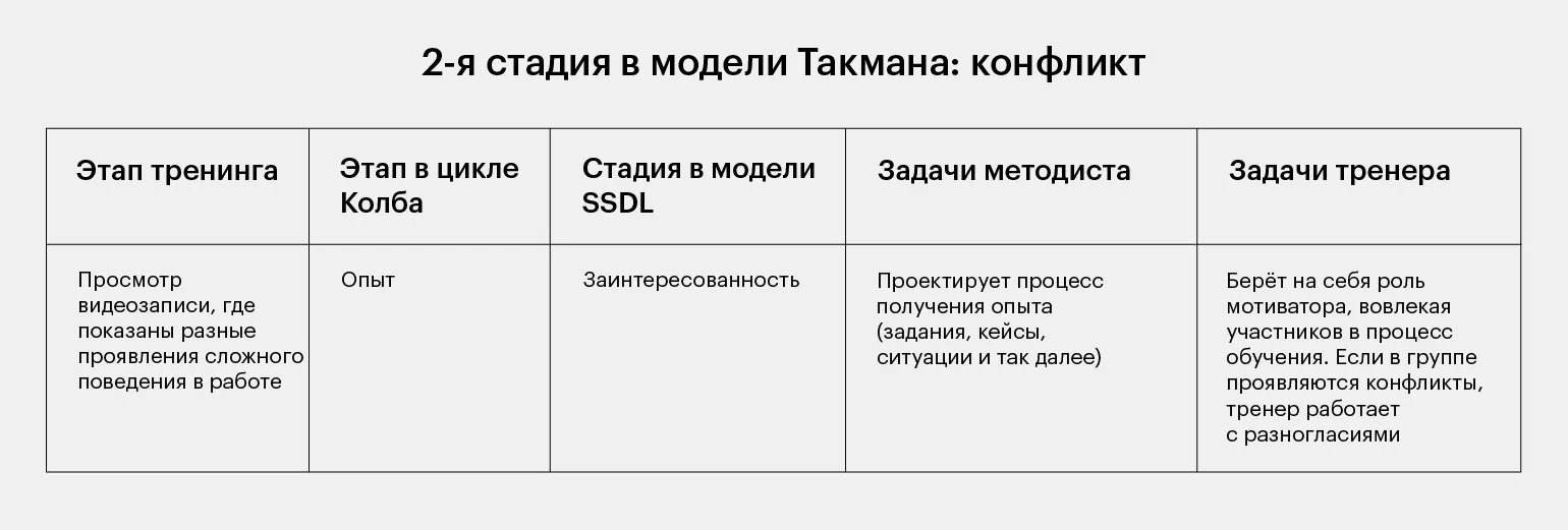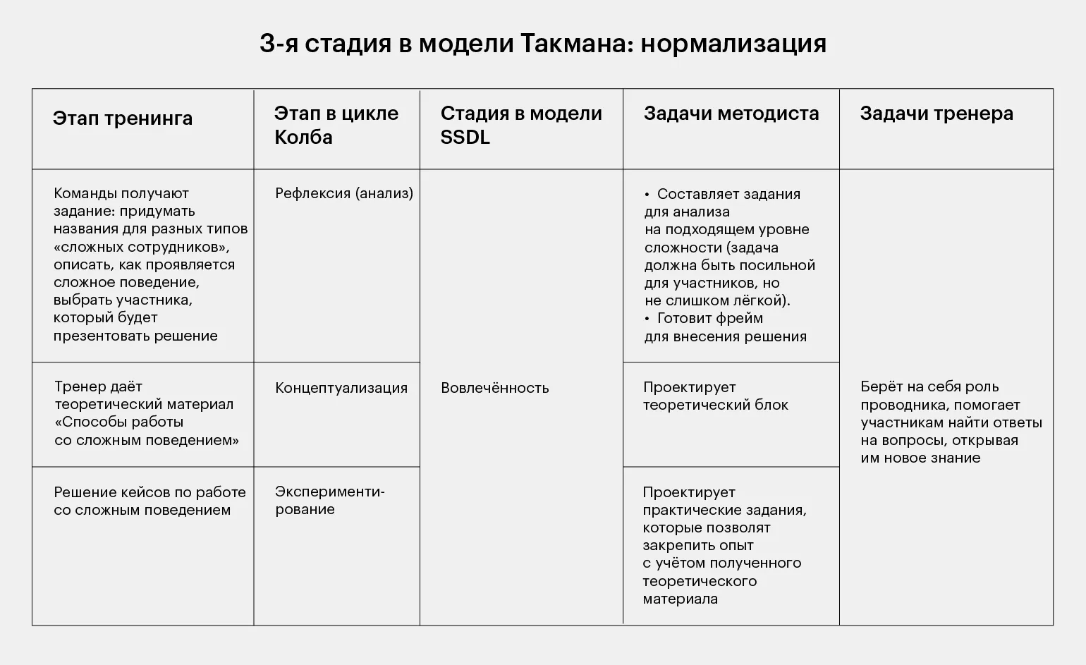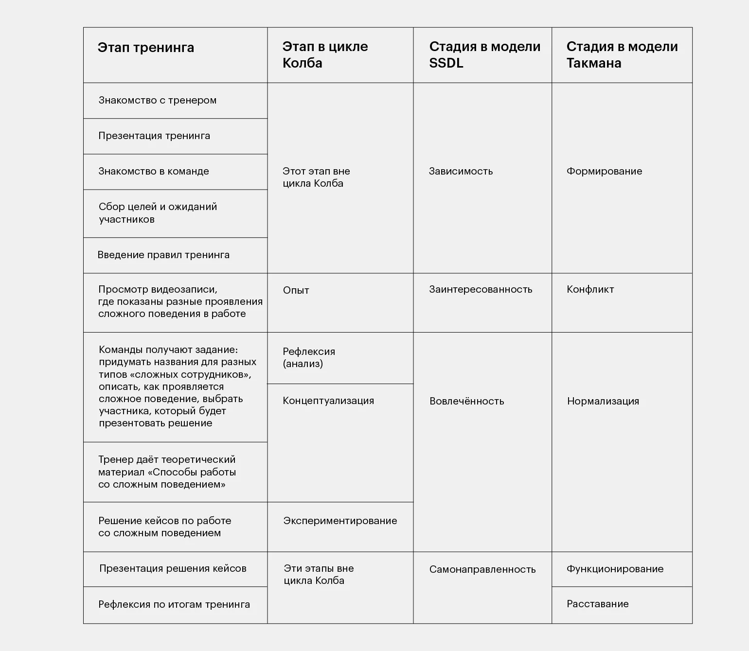 Как же соединить цикл Колба, модель Такмана и SSDL? Разберём на примере проектирования тренинга для менеджеров на тему работы со сложным поведением сотрудников в рабочей группе (это касается ситуаций, когда участники группы выражают активное или пассивное сопротивление при совместной работе и их действия снижают эффективность команды).