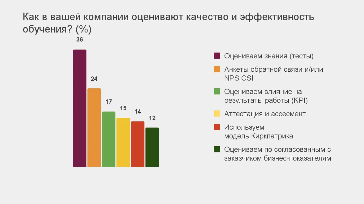 Однако прогресс всё же есть: на третье место по популярности вышли KPI — если в 2023-м такой инструмент использовали лишь 7% опрошенных, то в 2024-м их стало уже 43%. Такой же внушительный рост показала модель Киркпатрика — 30% в 2024-м и всего 4% в 2023-м. Эксперты отмечают, что это прекрасный тренд: хотя понятно, что инструменты часто применяют в связке (и по той же модели Киркпатрика не все доходят до конца), это всё равно говорит о том, что в отечественном корпоративном обучении начали менять свои подходы к оценке качества и реальных результатов учебных программ.