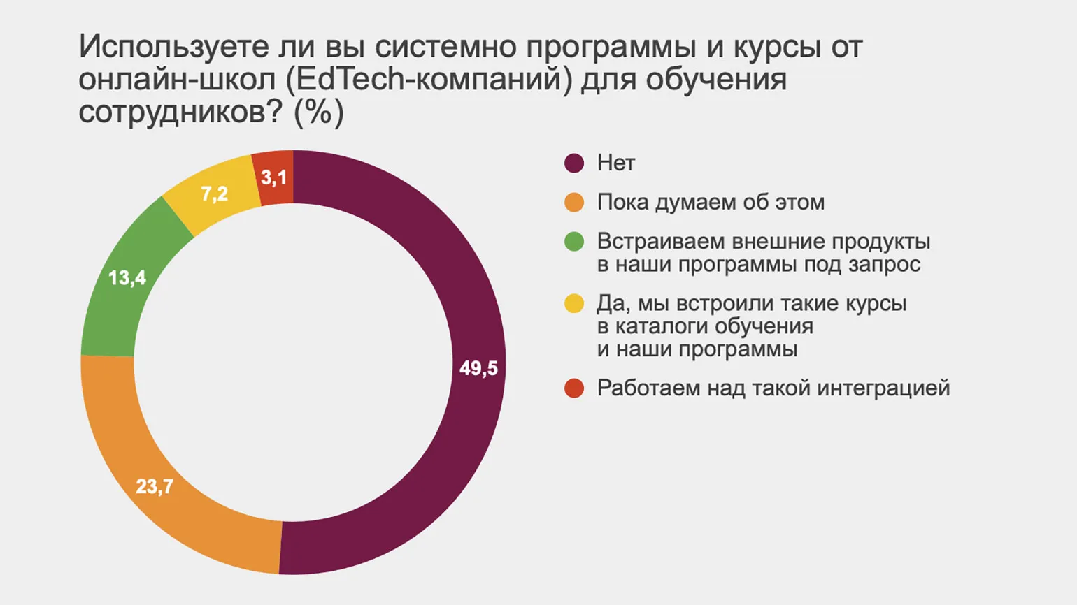Ситуация хоть и медленно, но меняется: если в 2022-м с EdTech-компаниями вообще никто из опрошенных не сотрудничал (а тогда респондентов было значительно больше), в 2023-м 5% наладили такое взаимодействие, а 14% начали разово пользоваться услугами онлайн-школ. В 2024 году уже 7% интегрировали сторонние курсы в обучение своего персонала, чуть больше 3% над этим работают, 13% делают это под конкретный запрос, а четверть опрошенных — как минимум думают о том, чтобы вовлечь EdTech-провайдеров в учебные процессы.