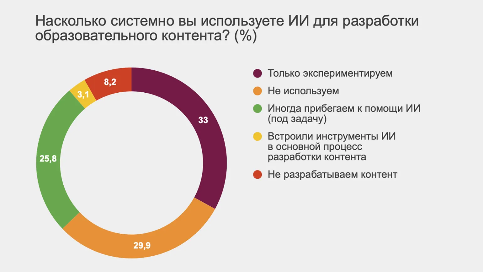 Авторы опроса также включили вопрос о системности использования ИИ для разработки контента.