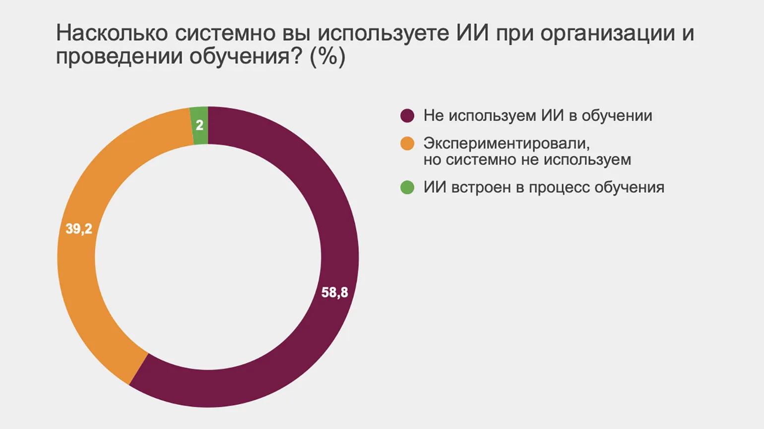 В 2023-м году, когда тема искусственного интеллекта набирала обороты, только 13% респондентов успели попробовать его инструменты в работе. Судя по данным опроса, в этом году уже больше компаний осваивают ИИ: почти 40% опрошенных экспериментируют с ним, а 2% успели полноценно встроить его в процессы обучения. Правда, подавляющее большинство пока, очевидно, не готовы с ним работать.