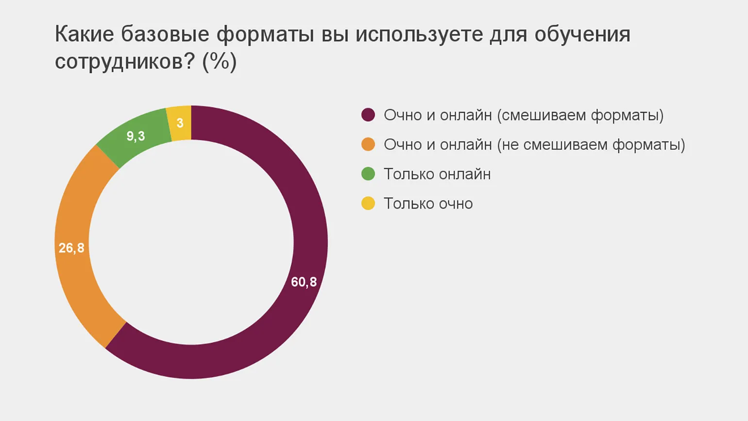 Чуть больше 60% опрошенных поделились, что в их компаниях соединяют элементы онлайна и офлайна в рамках одной программы. Ещё четверть респондентов также используют оба варианта, но не смешивают их между собой — то есть программы у них либо очные, либо онлайн. Полностью в виртуальное пространство перешли лишь 9%, а доля предпочитающих исключительно «живое» обучение ещё меньше. Всё это говорит о том, что практика в российских компаниях устоялась и изменений не требует, считает Павел Безяев.