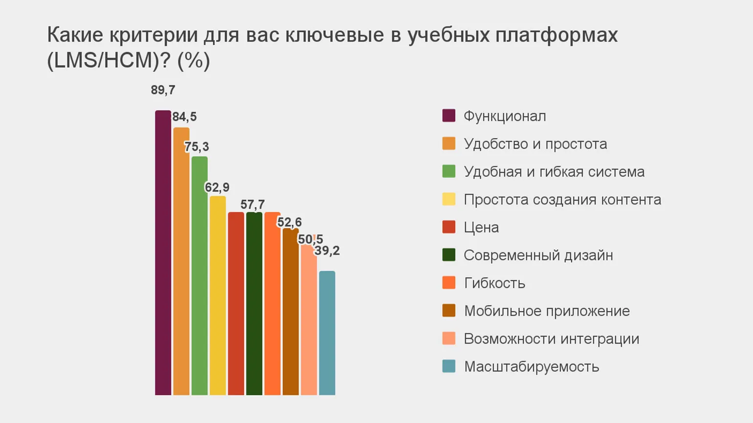 Год спустя ситуация поменялась мало. Наиболее важным в LMS считают их функционал, причём для многих это функционал в сфере адаптивного и персонализированного обучения. Респонденты всё ещё считают, что платформы стоит дорабатывать для удобства пользователей, и хотели бы видеть побольше возможностей для аналитики.