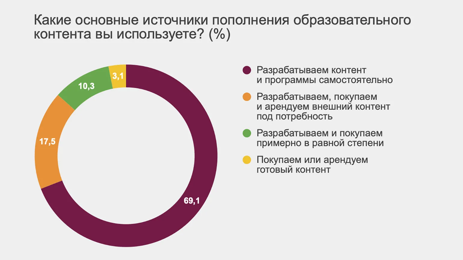 Авторы исследования уже не первый год отмечают, что особого смысла в постоянном производстве собственных курсов и программ нет, ведь сейчас рынок полон предложений на любой вкус и кошелёк. Однако пока призывы покупать этот контент явно не были услышаны: в этом году производивших собственный контент стало даже больше — 97%.