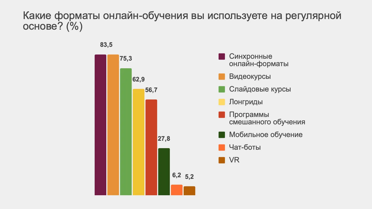 Первое место в списке форматов разделили синхронные активности (вебинары, мастер-классы) и асинхронные видеокурсы. Замыкает же пятёрку лидеров комбинация из синхронного и асинхронного онлайн-обучения, а также лонгриды.