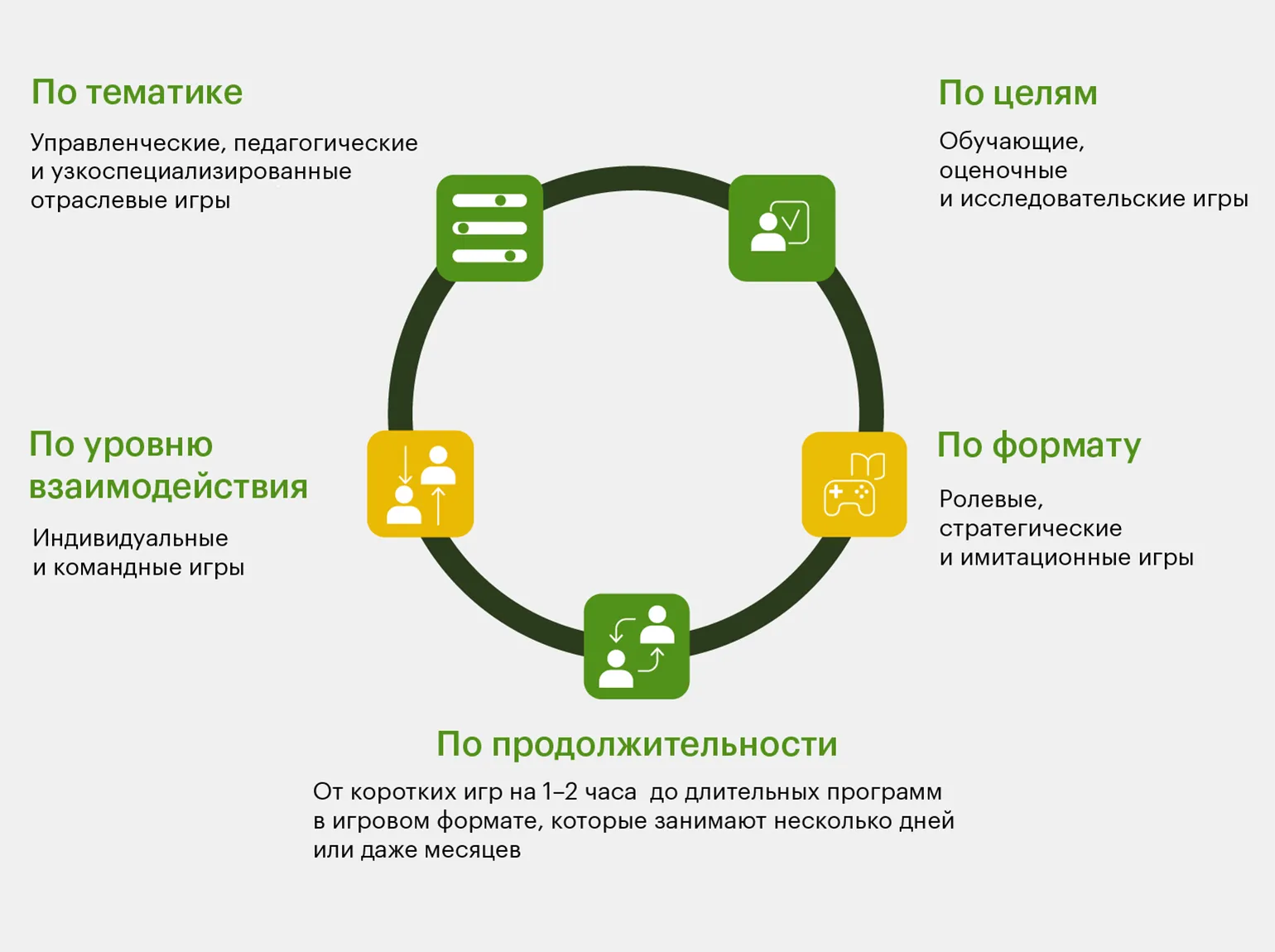 Используя эти подходы к классификации игр, можно подобрать подходящий по параметрам формат. Например, для тренинга по переговорам подойдёт короткая обучающая ролевая игра. А для длительной программы обучения управленцев — стратегическая командная.