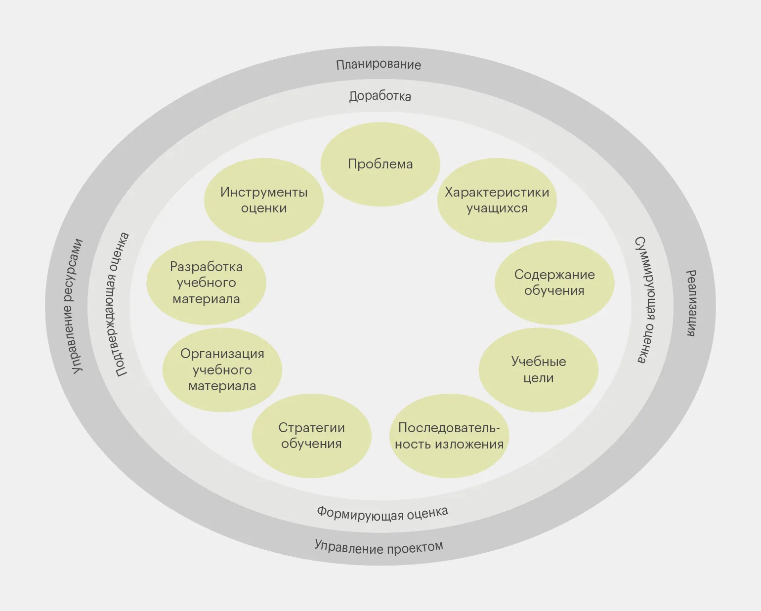 Итак, девять описанных выше компонентов и составляют модель проектирования обучения Моррисона, Росса и Кемпа. Изображают её в виде овала: на внешней границе фигуры расположены ещё несколько элементов — они означают организационные процессы и компоненты, которые сопровождают проектирование: планирование работы, управление проектом, доступные педдизайнеру ресурсы, реализация разработанной программы. А в среднем кольце расположены разновидности оценки качества самой программы и её доработка.