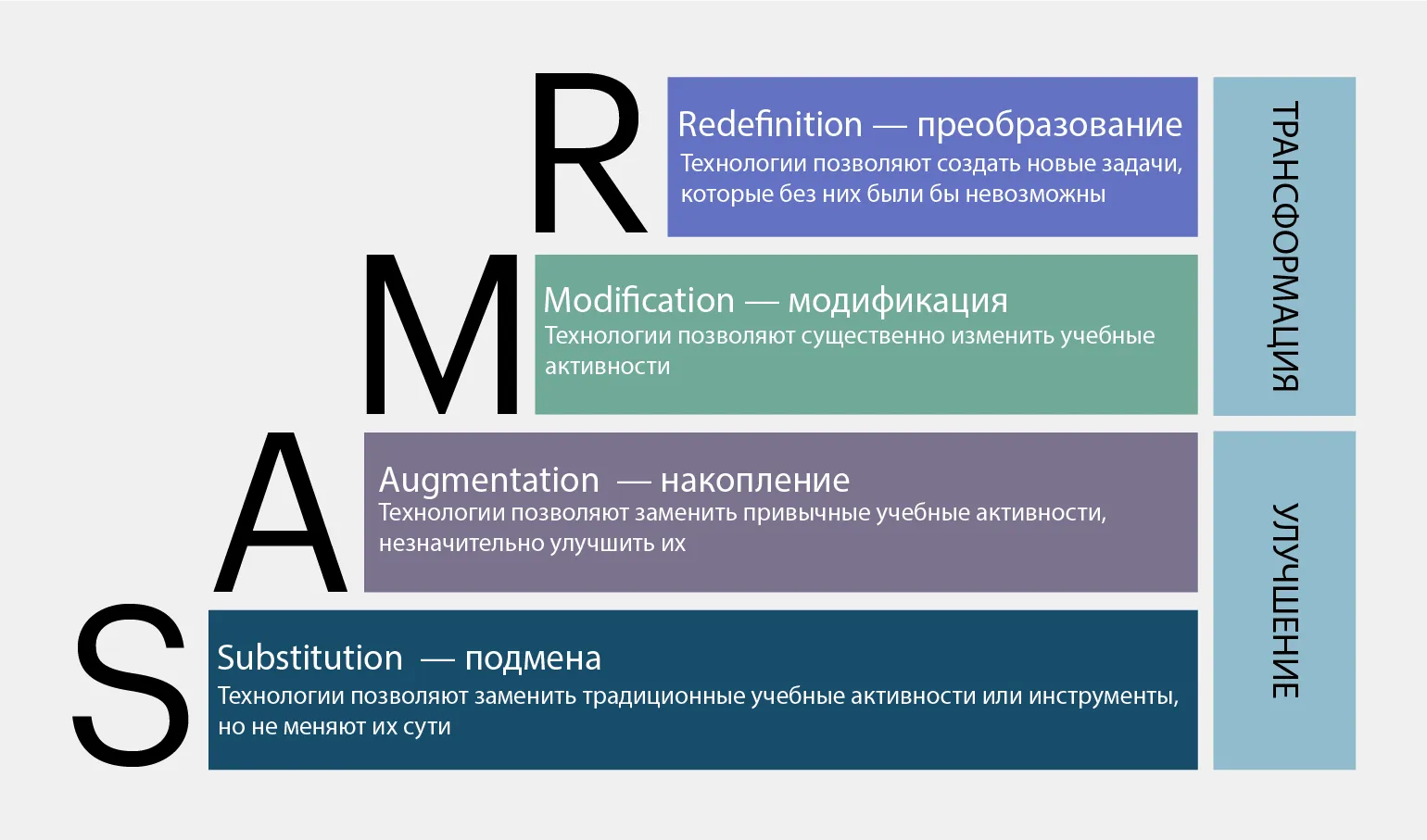 SAMR — это тоже фреймворк для преподавателей и методистов, описывающий четыре уровня интеграции технологий в обучение. Собственно, название — аббревиатура этих уровней: