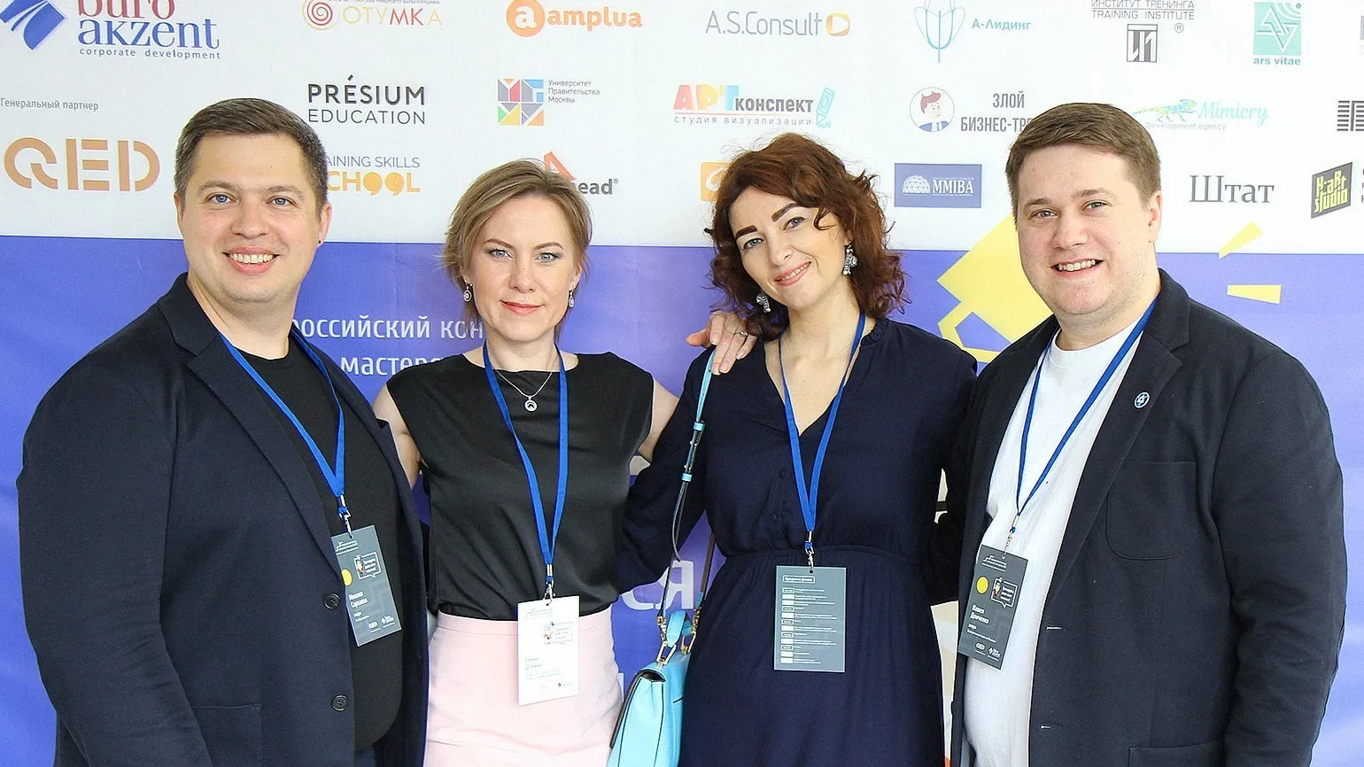Елена Долина (вторая слева) с членами жюри всероссийского конкурса тренерского мастерства Михаилом Сартаковым (бизнес-тренером управления по обучению, оценке и развитию департамента по работе с персоналом торговой сети «Перекрёсток»), Аллой Великановой (руководителем отдела обучения и развития персонала «Гедеон Рихтер Фарма») и Павлом Донченко (руководитель отдела тренеров Корпоративной Академии Росатома). Фото предоставлено Buro Akzent