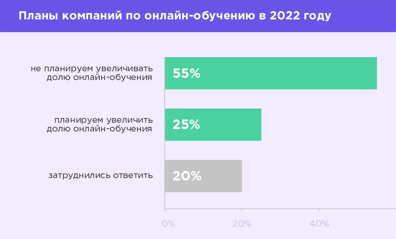 По данным исследователей, в 2022 году треть опрошенных планирует активнее обучать сотрудников. При этом половина респондентов не сформировали новую стратегию обучения, а ещё 20% вообще не планируют менять свои планы и темпы обучения персонала.